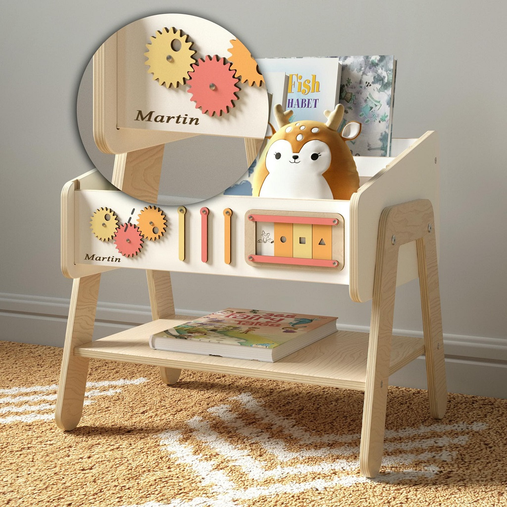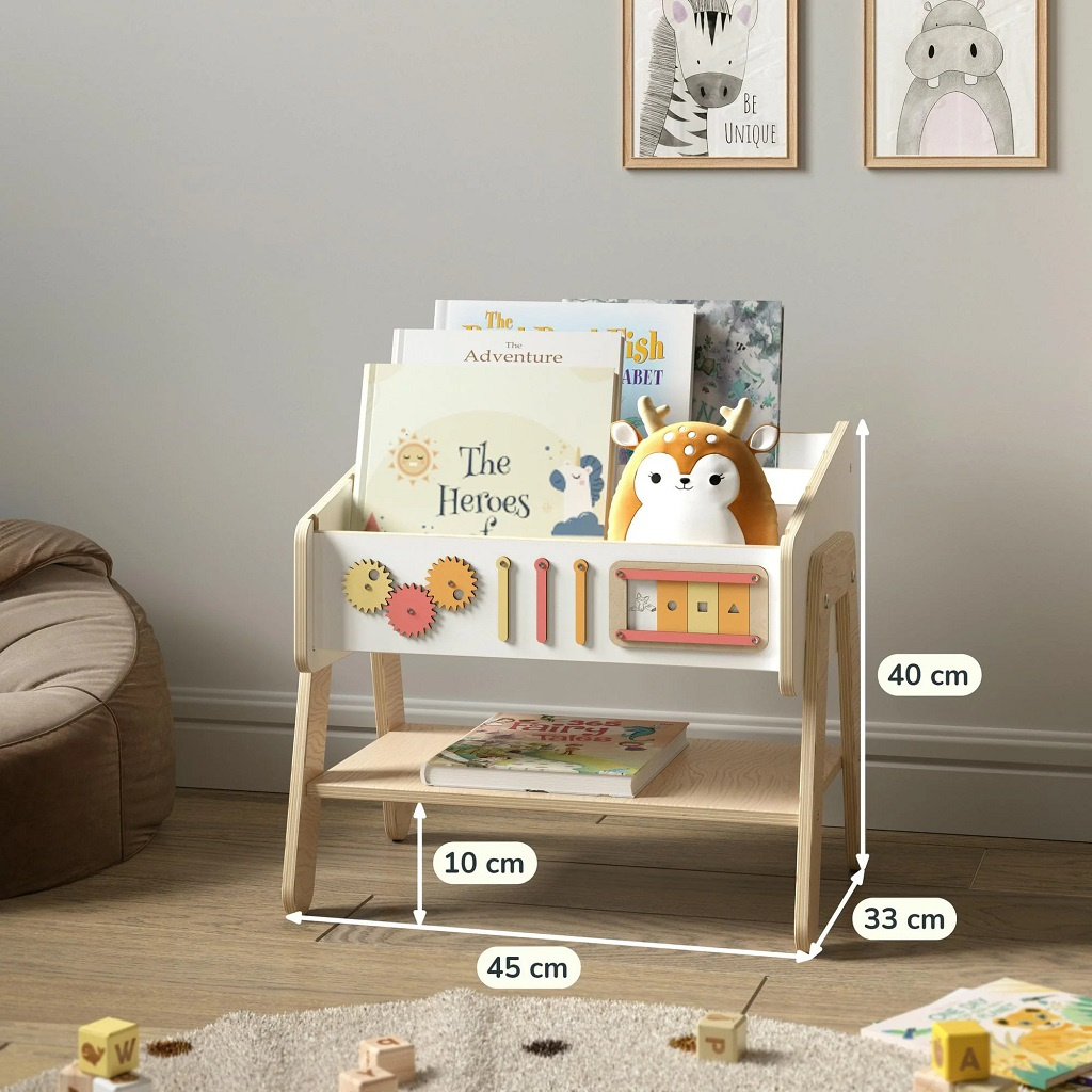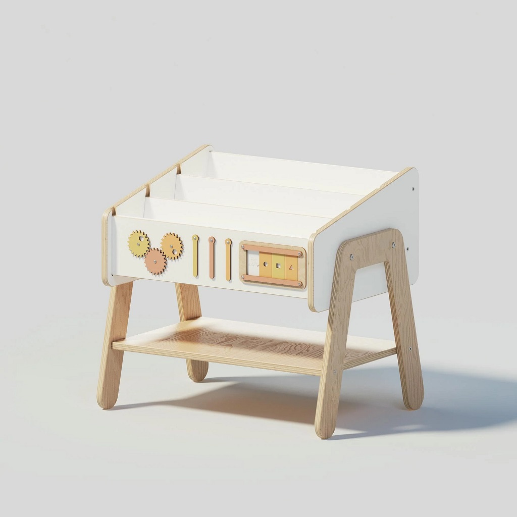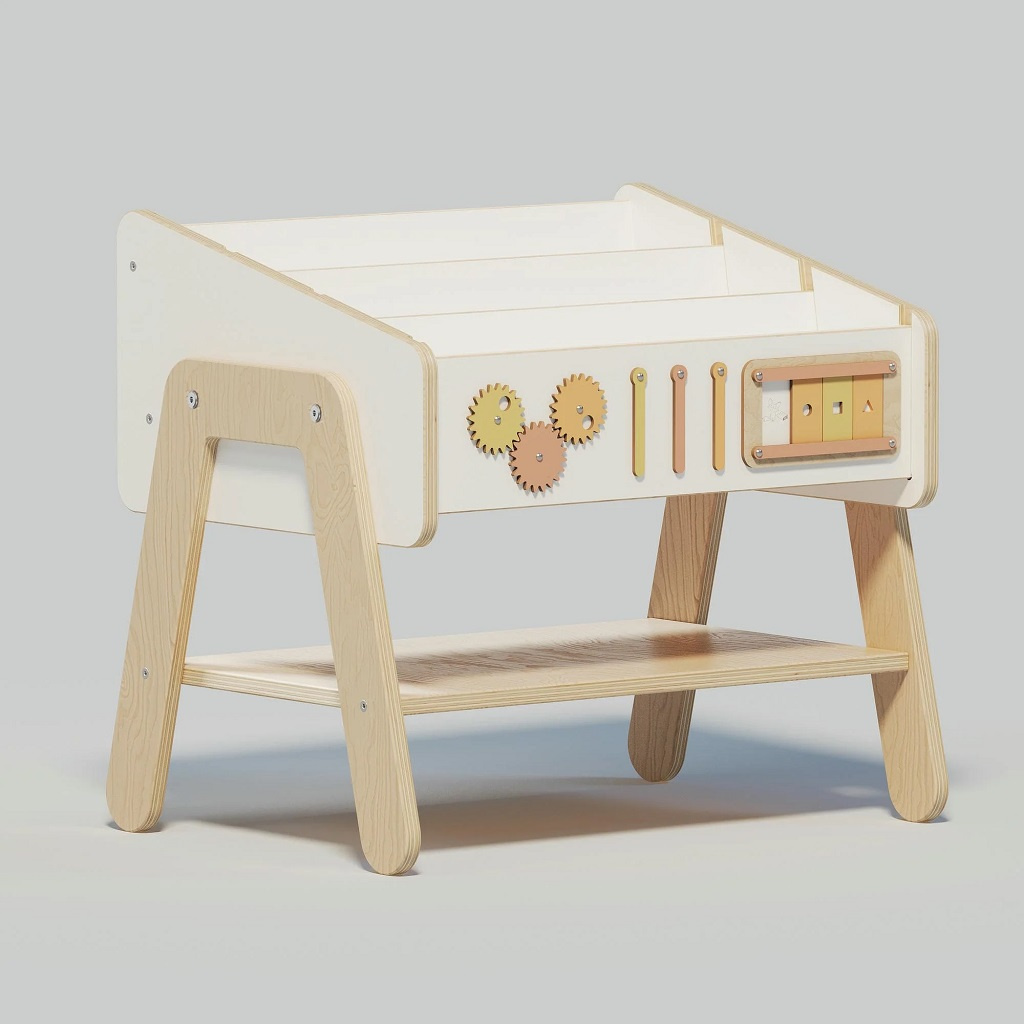 Tento chytrý kousek nábytku ocení zejména rodiče, kteří potřebují funkční a prostorově úsporné řešení. Police Lilu v sobě spojuje tři praktické funkce, doplňuje ji interaktivní panel pro hru a rozvoj a je vyrobena z přírodních, bezpečných materiálů. Přirozené zbarvení, suky i jemné nepravidelnosti ve dřevě dělají z každého kusu originál.
