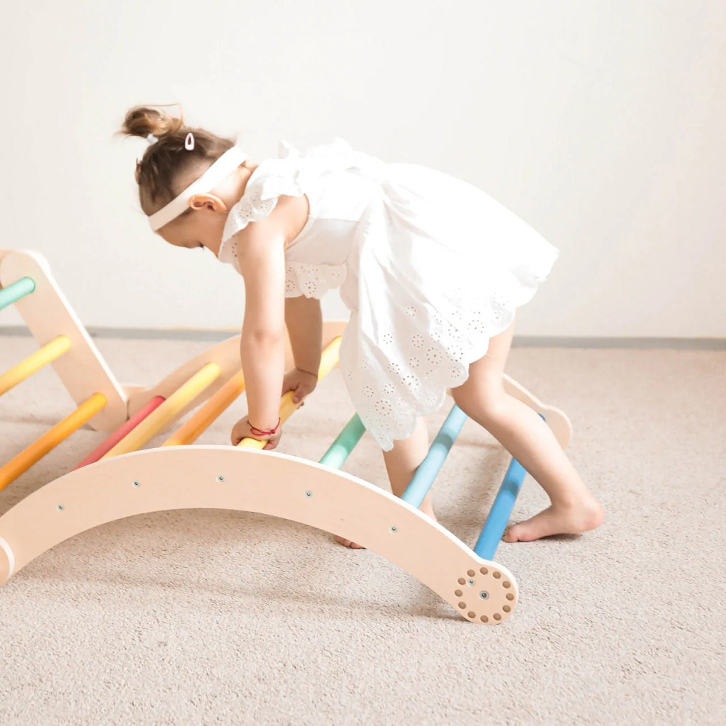 Mít vlastní herní park přímo doma to je sen každého dítěte. Tato velká lezecká sada nabízí desítky variant sestavení, které snadno změníte bez použití nářadí. Je vhodná pro menší děti i pro ty, které už rády zdolávají výšky. Díky kombinaci přírodního dřeva a nádherných duhových barev se stane atraktivní součástí dětského pokoje nebo herny.