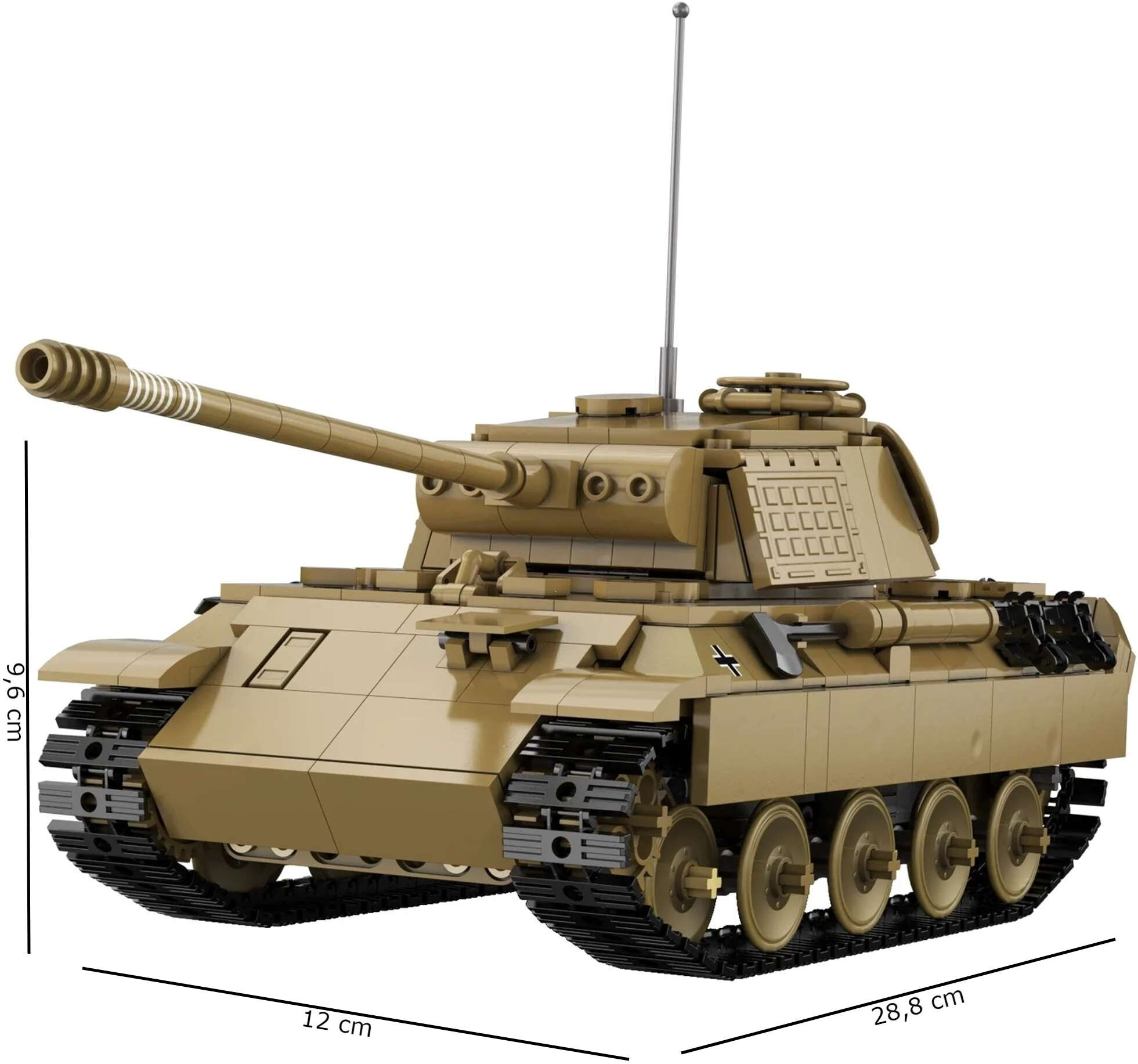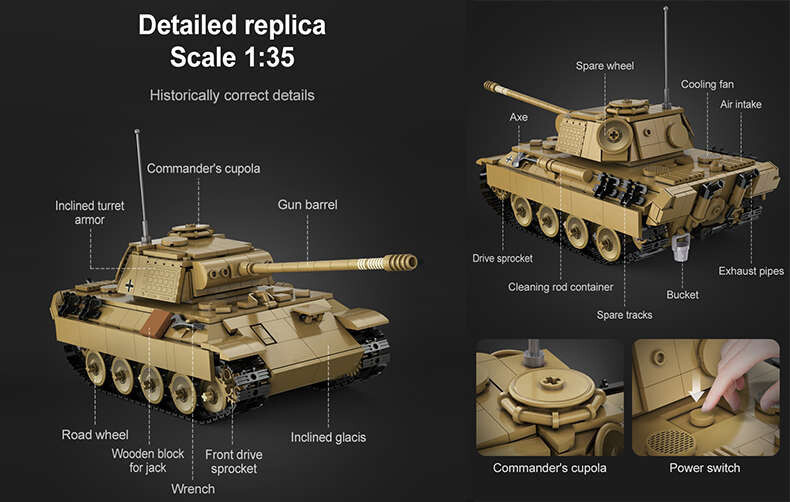 Sestavený model o rozměrech 28, 8 cm na délku, 12 cm na šířku a 10 cm na výšku je vybaven dálkovým ovládáním 2.4 GHz, kterým můžete ovládat směrový pohyb tanku včetně otáčení věže. Model je sestaven z 907 dílků a je věrnou kopií legendárního tanku z 2. světové války. Sada je zabalena v elegantním obalu, takže je stavebnice ideální jako dárek.
