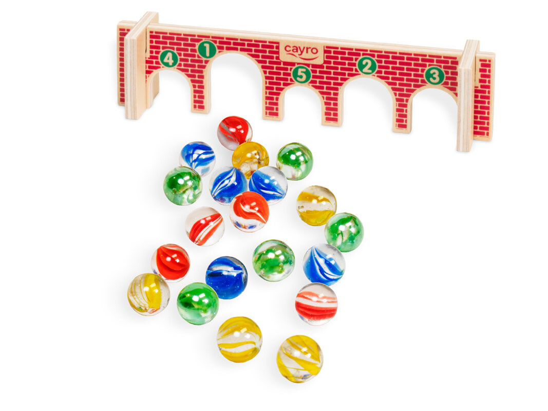 1. Hra „Most“: Cílem je cvrnknout kuličku tak, aby projala otvorem v dřevěném mostě. Čím menší otvor trefíte, tím více bodů získáte! Vzdálenost střelby můžete snadno přizpůsobit věku a zkušenostem hráčů.