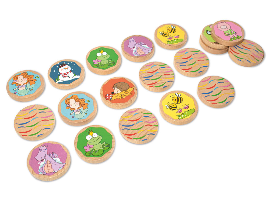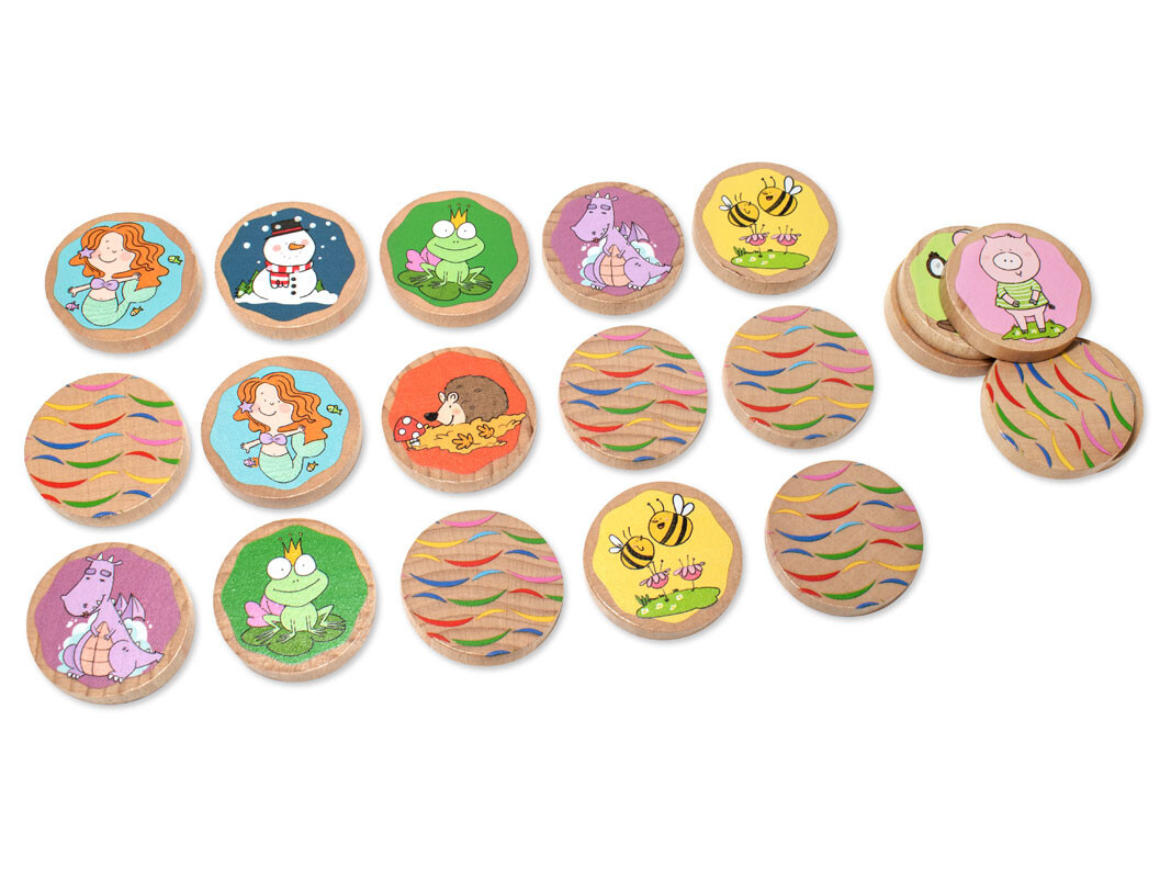 Pexeso tak trochu jinak. Zahrajte si s kulatými dřevěnými žetony, které se hned tak neopotřebují. Postřehová hra pro 2 až 4 hráče od 2 let věku. Ideální pro hru ve dvojici i kolektivu, do které se mohou zapojit děti i dospělí. Hra je vyrobena z přírodního FSC dřeva, žetony mají rozměry 0,7 cm x Ø 4,5 cm. Hra rozvíjí intra a interpersonální dovednosti, postřeh, prostorovou orientaci a logické uvažování.