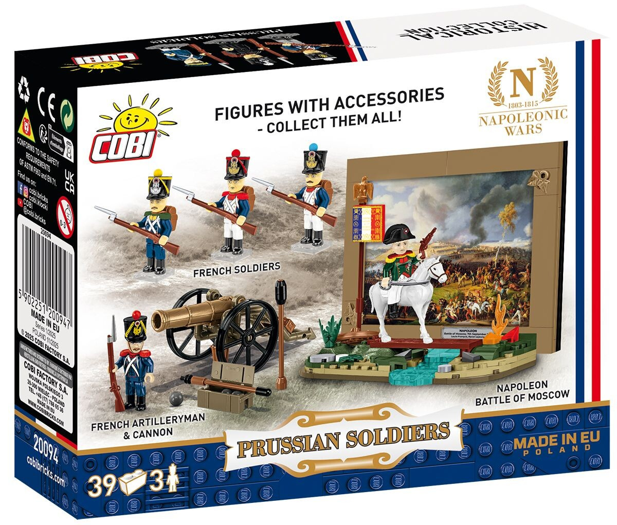 Rozšiřte svou sbírku napoleonských vojáků o tři detailně zpracované figurky pruské pěchoty. Stavebnice obsahuje 39 kvalitních kostek a představuje tři různé typy vojáků – každý s vlastním výrazem, výstrojí a zbraní. Součástí jsou realistické doplňky jako tornistry, mušket s bodákem či typické čako. Všechny kostky mají odolné potisky bez použití samolepek a odpovídají historickému období. Ideální sada pro malé stavitele i sběratele diorám.