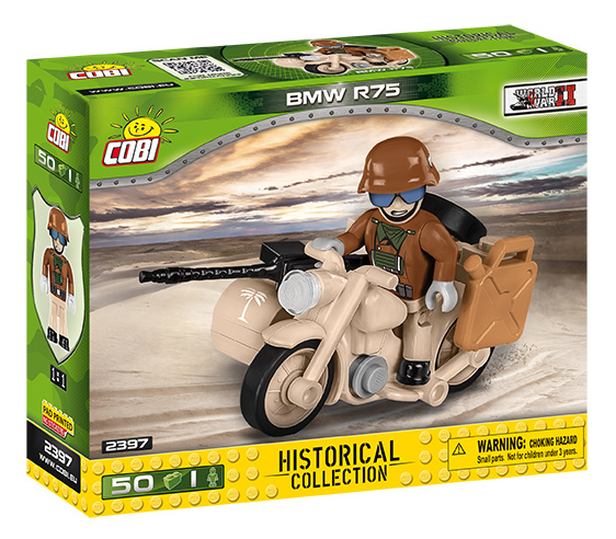 Postavte si model legendárního německého motocyklu z období 2. světové války v barvách Deutsches Afrikakorps! Sestavené vozidlo měří 9 cm na délku a 3 cm na výšku. Model má pohyblivá kola s gumovými pneumatikami, součástí je i kulomet MG 34, rezervní kolo a kanystr. Stavebnice obsahuje 50 kostek, figurku německého vojáka v tropické uniformě s odnímatelnými gumovými brýlemi a jako bonus sběratelskou kartu.