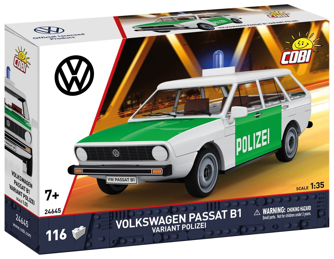 Postavte si Volkswagen Passat B1 Variant Policie, klasický policejní vůz ze 70. let, který patřil k typickým služebním automobilům západoněmecké policie. Tento model v měřítku 1 : 35 obsahuje 116 kostek a po sestavení dosahuje rozměrů 13 cm na délku, 5,5 cm na šířku a 5,5 cm na výšku. Model věrně zachycuje podobu tehdejšího policejního kombi včetně charakteristického služebního zbarvení, modrého výstražného světla („majáku“) na střeše, klasické masky chladiče a dobových detailů karoserie. Vůz je vybaven otáčivými koly s gumovými pneumatikami, což umožňuje vystavení i hru. Detaily a označení jsou zpracovány pomocí trvalých potisků a kvalitních samolepek a model vznikl na oficiální licenci Volkswagen.