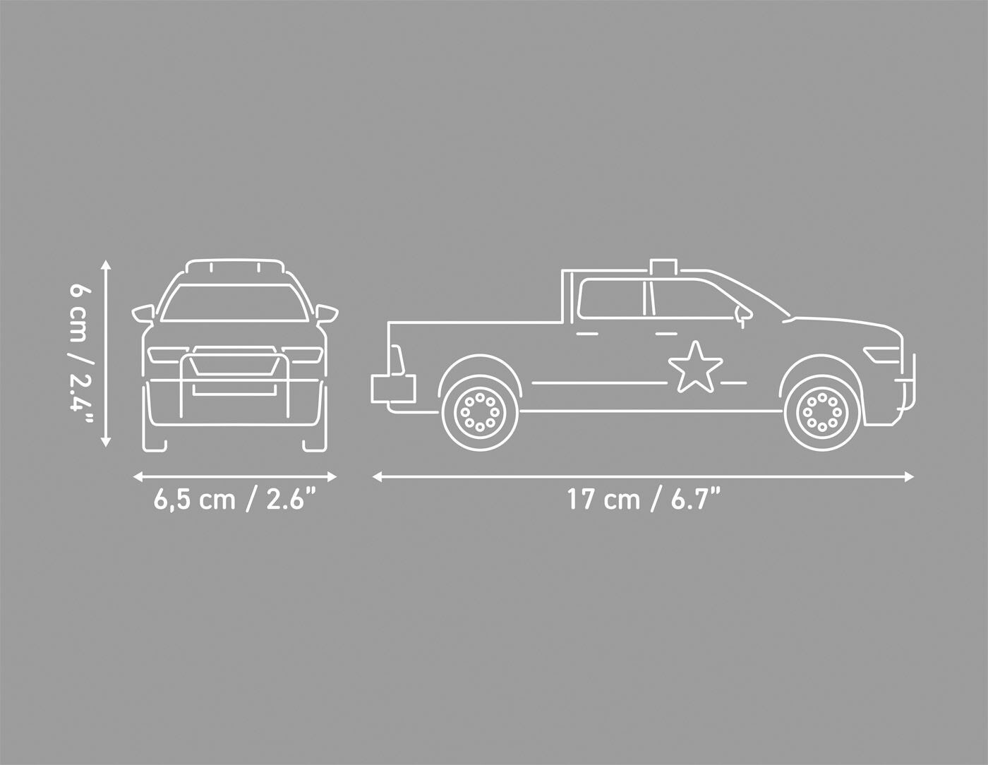 RAM 1500 je plnohodnotný pickup americké značky RAM, známý svou odolností, silnými motory HEMI a schopností zvládat náročné podmínky mimo zpevněné komunikace. Díky pohonu 4×4 a vysoké spolehlivosti se dlouhodobě uplatňuje také ve flotilách amerických šerifských úřadů, zejména ve venkovských a těžko dostupných oblastech. Ve službách zákona slouží při hlídkování, zásazích i záchranných operacích a stal se symbolem autority a pořádku na nekonečných silnicích USA. Model věrně zachycuje charakter tohoto vozu, který je neodmyslitelně spjat s americkou policejní kulturou.