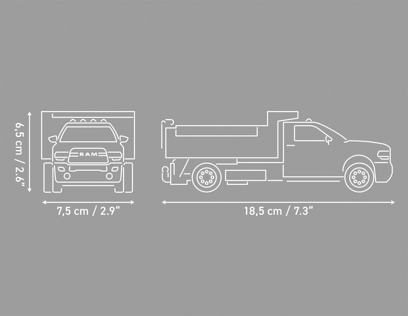 RAM 3500 patří mezi nejodolnější užitkové pickupy americké značky RAM (Stellantis) a je konstruován pro extrémní zatížení a náročné pracovní podmínky. Ve verzi Dump Truck kombinuje zesílený podvozek s praktickou sklápěcí nástavbou, která umožňuje rychlé vykládání materiálu. Díky výkonným motorům, robustní konstrukci rámu a vysoké nosnosti se stal běžnou součástí amerických staveb, lomů i infrastrukturních projektů. Model věrně zachycuje charakter pracovního vozu, který symbolizuje sílu, spolehlivost a každodenní nasazení v náročném provozu.