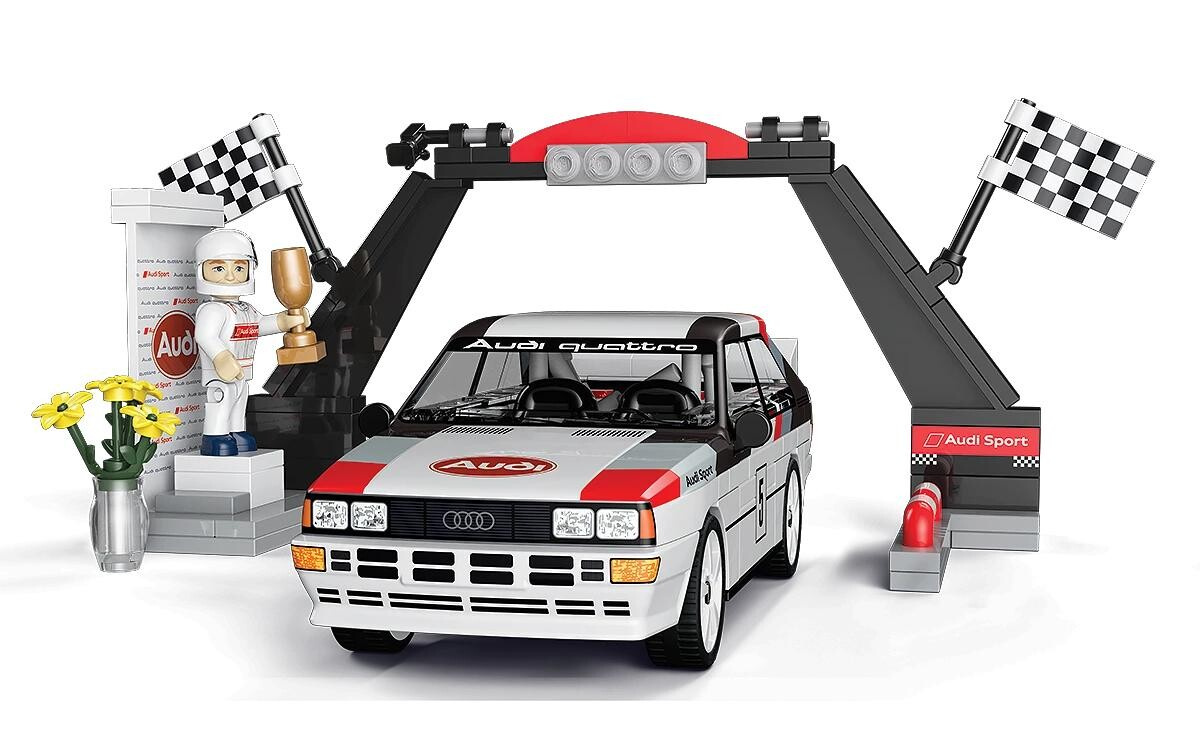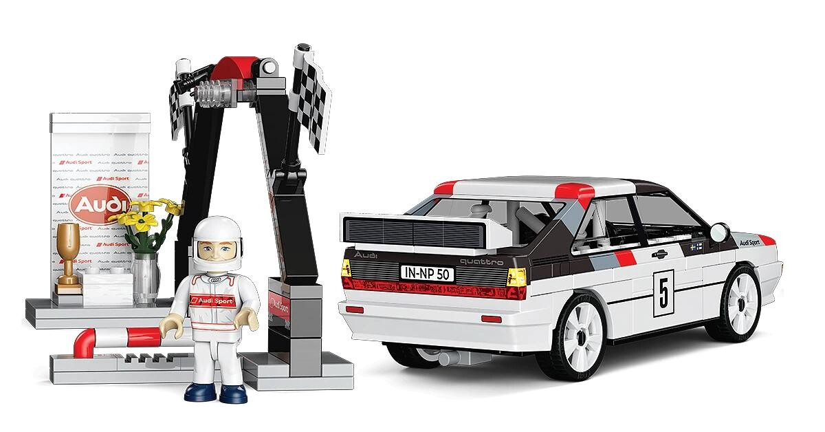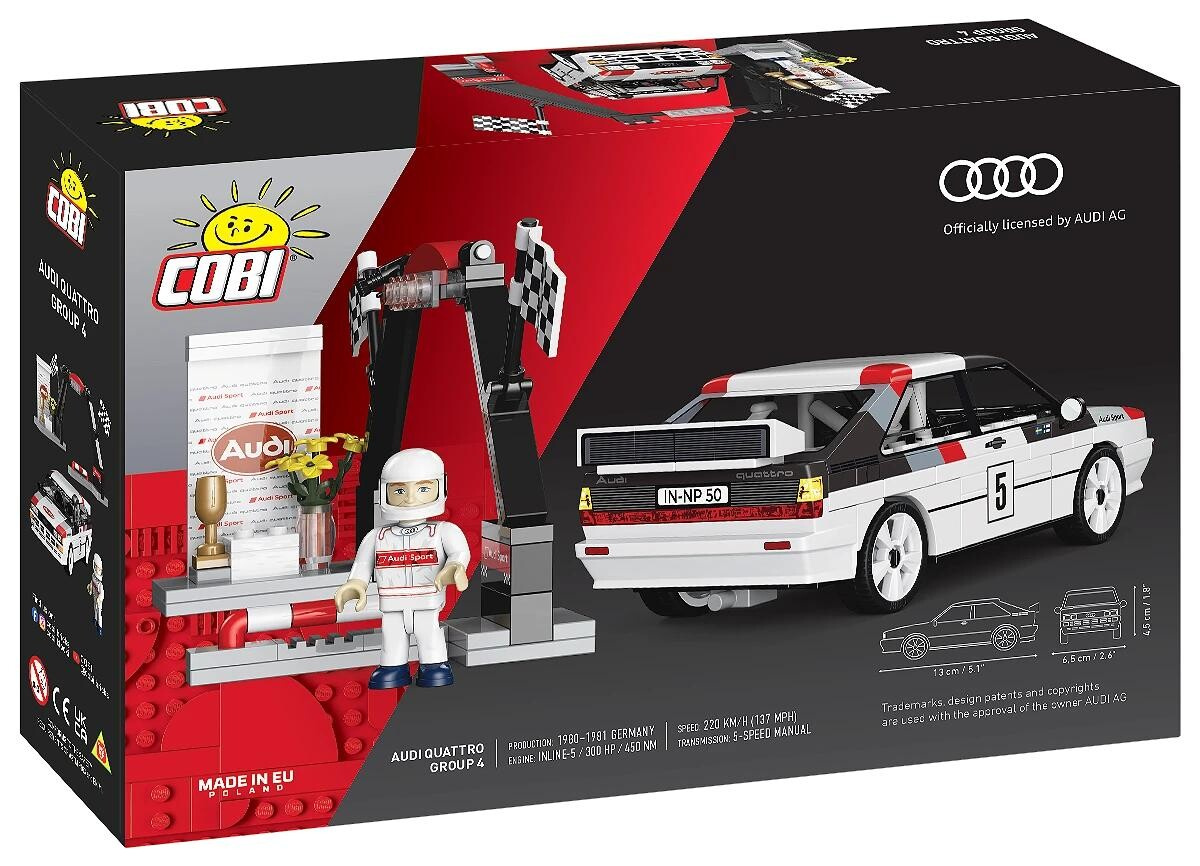 Postavte si Audi Quattro Group 4 (1981) a připomeňte si začátek revoluce pohonu všech kol v rally! Tento model v měřítku 1 : 35 obsahuje 167 kostek a po sestavení dosahuje rozměrů 13 cm na délku, 6,5 cm na šířku a 4,5 cm na výšku. Věrně zachycuje hranatou siluetu legendární rallyové verze z roku 1981, včetně sportovních proporcí a charakteristického designu. Součástí balení je také figurka jezdce inspirovaná Hannu Mikkolou, ceremoniální cílová brána, pódium, trofej a dekorativní doplňky. Model nabízí trvalé potisky i kvalitní samolepky a vznikl na oficiální licenci Audi.