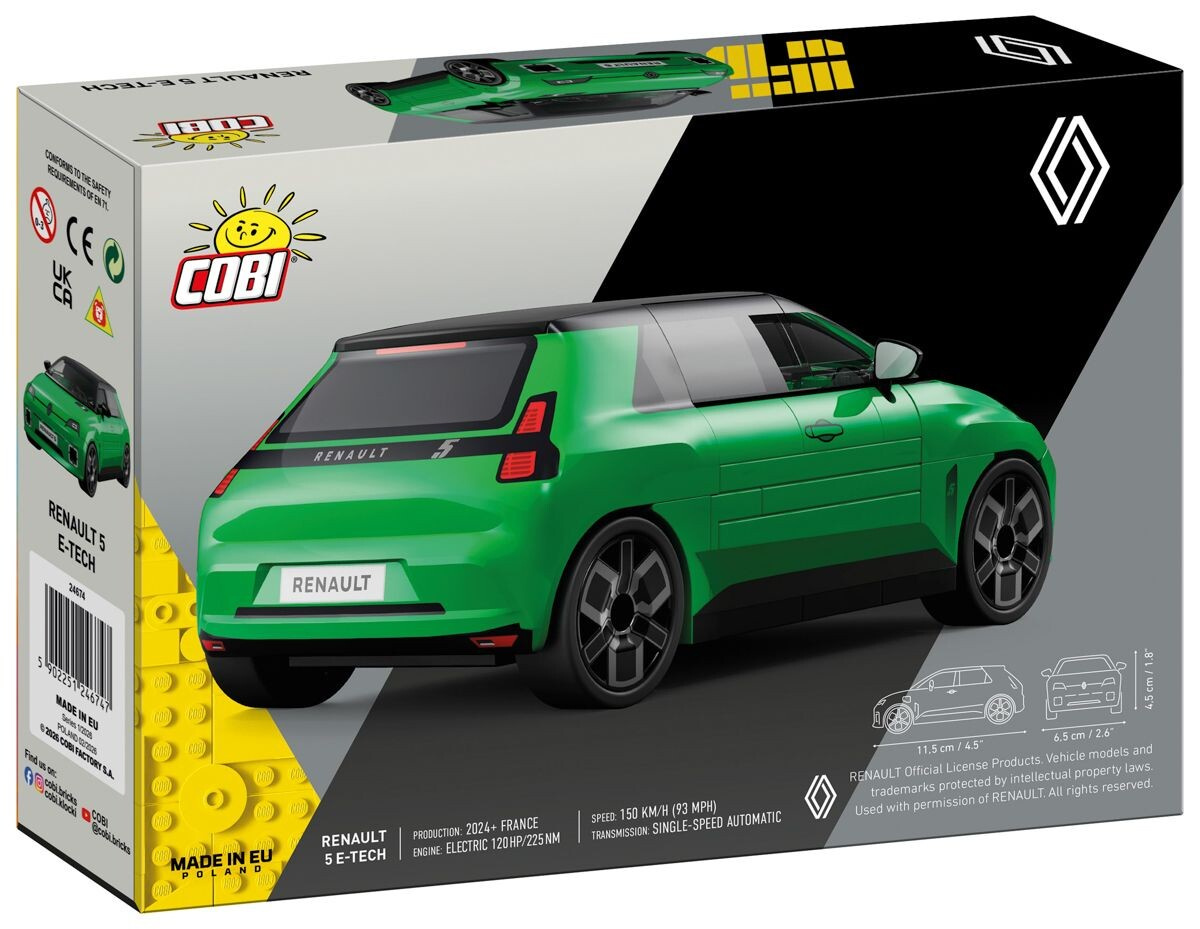 Postavte si Renault 5 E-Tech Electric, moderní elektrickou verzi legendárního evropského hatchbacku, který se v roce 2024 vrátil na scénu v nové podobě. Tento model v měřítku 1 : 35 obsahuje 78 kostek a po sestavení dosahuje rozměrů 11,5 cm na délku, 6,5 cm na šířku a 4,5 cm na výšku. Věrně zachycuje retro-futuristickou siluetu vozu v atraktivním zeleném provedení, včetně charakteristických světlometů a výrazných blatníků. Model je vybaven otáčivými koly s gumovými pneumatikami a detaily jsou zpracovány pomocí trvalých potisků v kombinaci s kvalitní samolepkou. Díky oficiální licenci Renault představuje autentický sběratelský model vhodný k vystavení i ke hře.