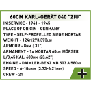 Postavte si model obléhacího německého děla Karl- Gerät 040 v měřítku 1:28. Model disponuje mnoha pohyblivými částmi, jako jsou otočná kola s funkčními pásy, hlaveň a nabíjecí systém. Součástí balení jsou dvě figurky dělostřelců, důstojníka a psovoda i se psem. Sestavený model měří 40 cm na délku, 16 cm na šířku a 16 cm na výšku. Stavebnice se skládá celkem z 1574 dílků a 5 figurek.