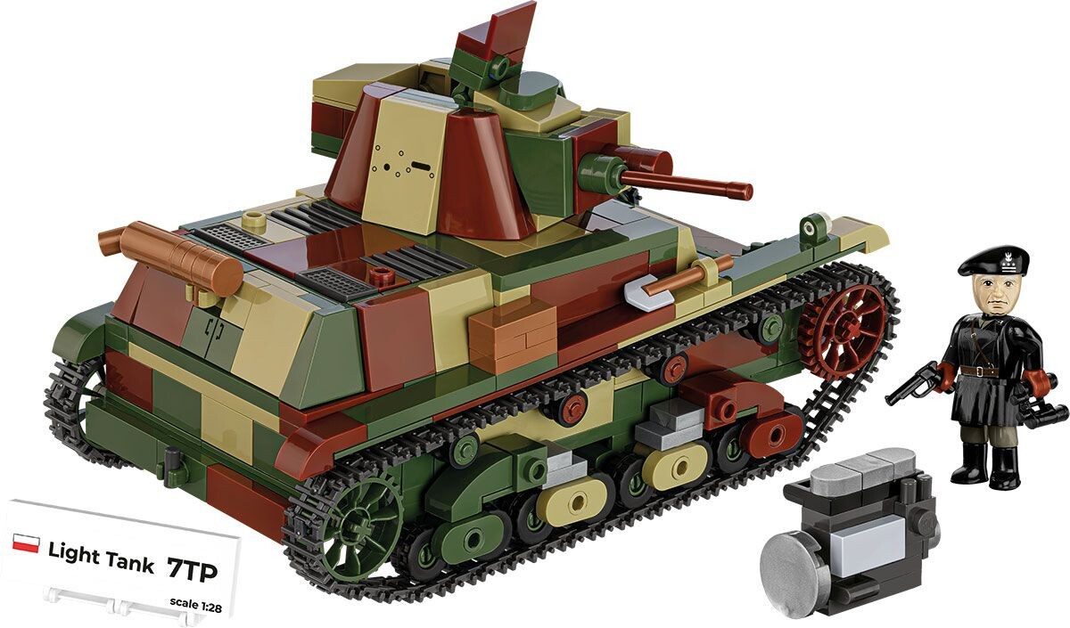 Lehký tank 7TP byl v roce 1939 nejmodernějším obrněncem polské armády – navržený jako vylepšení britského Vickerse, vybavený výkonným dieselem, periskopem Gundlacha a kanónem Bofors. Jeho tříbarevný kamufláž a odhodlané posádky sehrály významnou roli zejména u Piotrkówa Trybunalského, kde se dokázal postavit i německým tankům. Dnes je 7TP symbolem statečnosti i technické zdatnosti meziválečného Polska. Tato stavebnice od COBI je nejen poutavým modelem, ale také vzdělávacím zážitkem, který propojuje lásku k historii s radostí ze stavění.