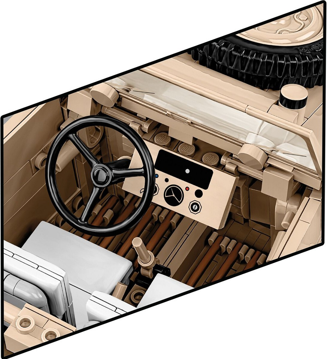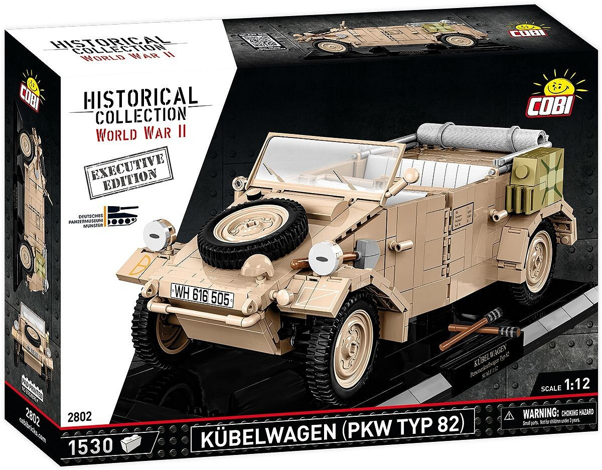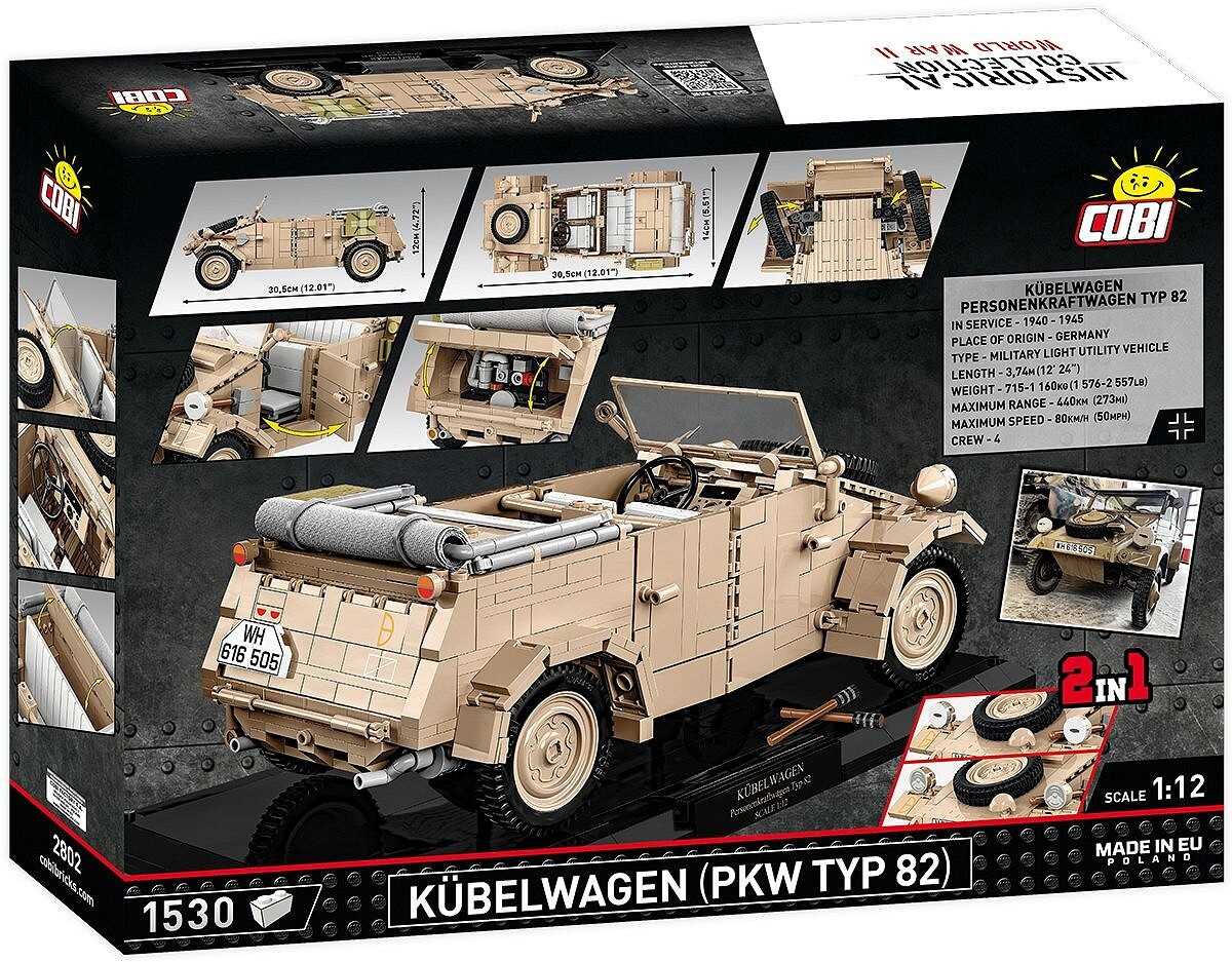 Sestavte si model německého terénního vozu Kübelwagen TYP 82 v měřítku 1:12. Byl navržen na základě muzejního kusu umístěného v Deutsches Panzermuseum Munster (Německo). Model se skládá z 1530 prvků a po sestavení měří 30,5 cm na délku, 14 cm na šířku a 12 cm na výšku. Pozornost upoutá pečlivě zpracovaný exteriér a interiér a zcela nové prvky navržené přímo pro potřeby takto velké sestavy. Interiér vozu je detailně propracovaný ve všech směrech, včetně volantu, sedadel, knoflíků, spínačů a motorového prostoru obsahujícího maketu motoru! Exteriér také zvyšuje laťku, pokud jde o přesnost proporcí a detailů, které může poskytnout pouze sada této velikosti. To zahrnuje sklápěcí okno, otevírací dveře, přístup do kufru a motorového prostoru, prvky výbavy a natáčecí kola, která lze ovládat volantem.