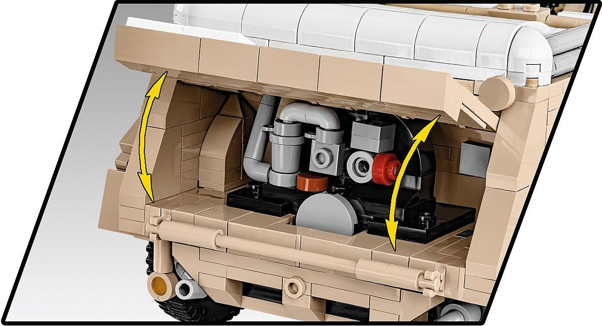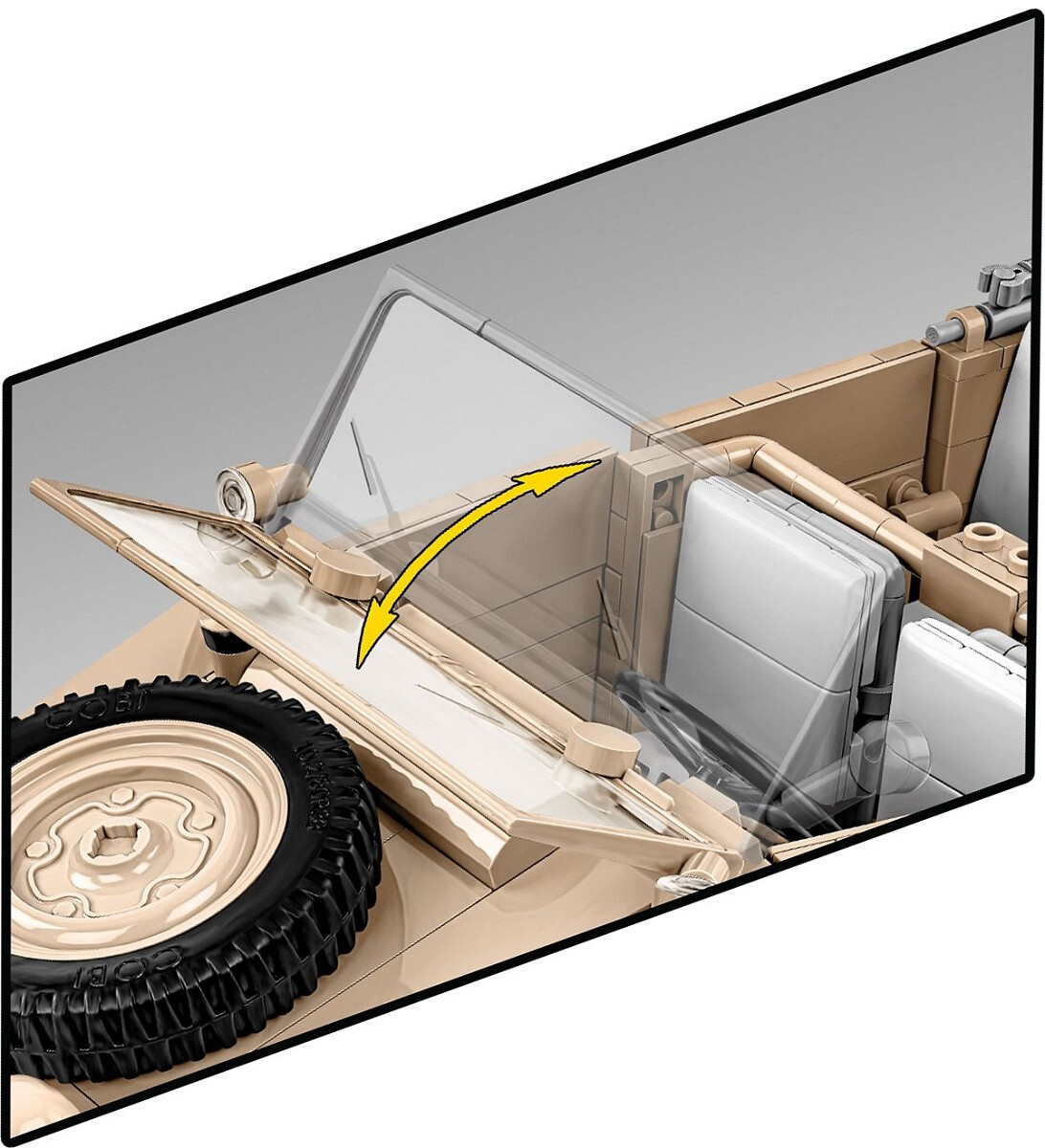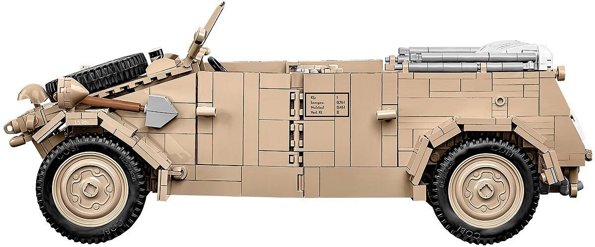 Sestavte si model německého terénního vozu Kübelwagen Typ 82 v měřítku 1:12. Byl navržen na základě muzejního kusu umístěného v Deutsches Panzermuseum Munster (Německo). Model se skládá z 1326 prvků a po sestavení měří 30,5 cm na délku, 14 cm na šířku a 12 cm na výšku. Pozornost upoutá pečlivě zpracovaný exteriér a interiér a zcela nové prvky navržené přímo pro potřeby takto velké sestavy. Interiér vozu je detailně propracovaný ve všech směrech, včetně volantu, sedadel, knoflíků, spínačů a motorového prostoru obsahujícího další nástroje! Exteriér také zvyšuje laťku, pokud jde o přesnost proporcí a detailů, které může poskytnout pouze sada této velikosti. To zahrnuje sklápěcí okno, otevírací dveře, přístup do kufru a motorového prostoru, prvky výbavy a natáčecí kola, která lze ovládat volantem.