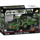 Sestavte si model legendárního terénního automobilu Jeep Willys MB s přívěsným vozíkem M-100 v obřím měřítku 1:12! Model v klasické zelené kamufláži je vybaven kulometem Browning upevněným na otočné lafetě. Má sklopný rám čelního skla, otevírací kapotu motoru a plně funkční podvozek ovládaný pohyblivým volantem. Vozík je možné odpojovat a připojovat. Model sestavený z 1580 dílků má včetně vozíku rozměry 47 cm na délku, 14 cm na šířku a 15,5 cm na výšku. Stavebnice je vyrobena v oficiální licenci společnosti Jeep.