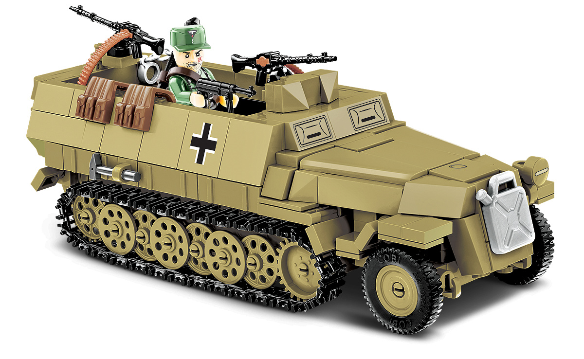 Postavte si model německého polopásového obrněného vozidla Sd.Kfz. 251 Ausf.D v měřítku 1:35. Sestavený model v olivové kamufláži měří 17 cm na délku, 7,2 cm na šířku a 6,5 cm na výšku. Má řadu pohyblivých prvků, jako jsou otevírací zadní pancéřované dveře, přední a zadní závěs s kulometem MG 34 a funkční pásový podvozek. Balení obsahuje 463 dílů a figurku německého vojáka vyzbrojeného samopalem a pancéřovou pěstí. Stavebnice je vyrobena pod oficiální licencí PC hry Company of Heroes 3, společnosti Relic.