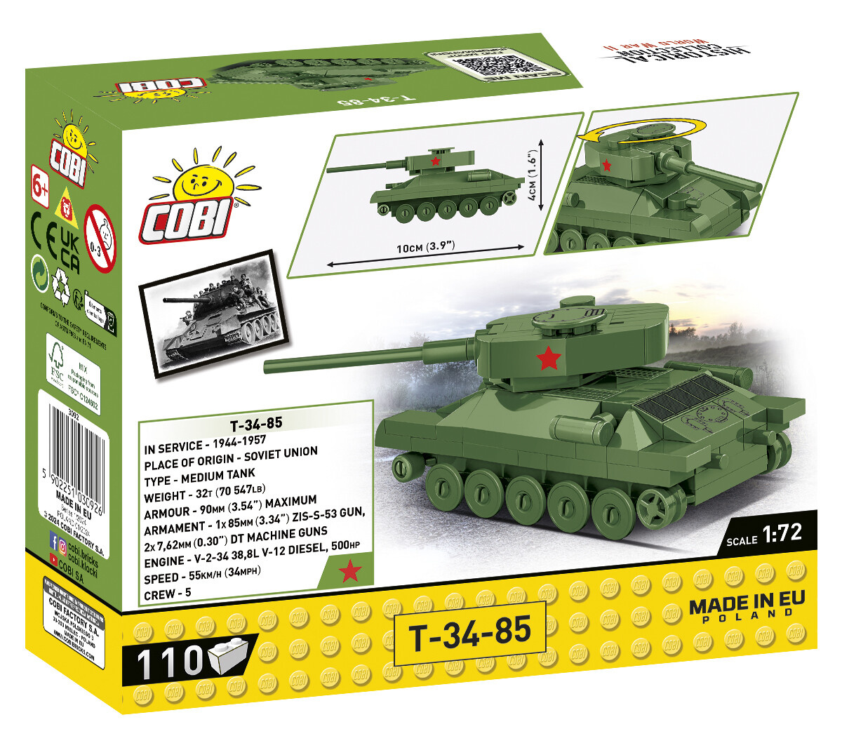 Postavte si model tanku T-34/85 v měřítku 1:72. Sestavený model se skládá ze 110 dílků a měří 10 cm na délku, 4,5 cm na šířku a 4 cm na výšku. Na bocích věže jsou potisky se sovětským označením. Tank lze přemisťovat díky namontovaným kolečkům. Věž tanku je také pohyblivá a lze jí otáčet.