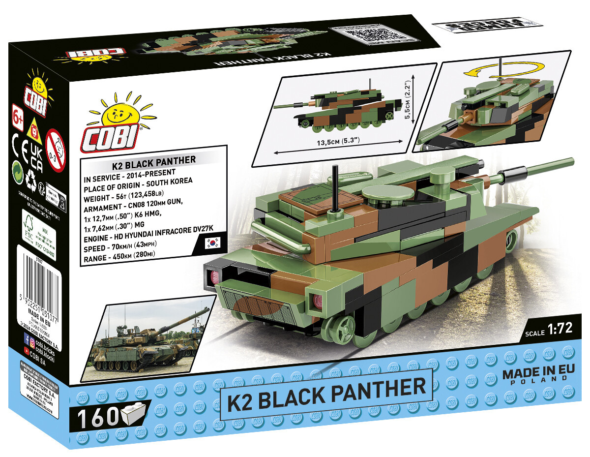 Postavte si model korejského tanku K2 Black Panther v měřítku 1:72. Sestavený model se skládá ze 160 dílků a měří 13,5 cm na délku, 5 cm na šířku a 5,5 cm na výšku. Formou potisků naznačeny mřížky a klapky na zadní části modelu. Tank je v maskovacím provedení s otočnou věží. Model lze po zemi přemisťovat pomocí koleček.