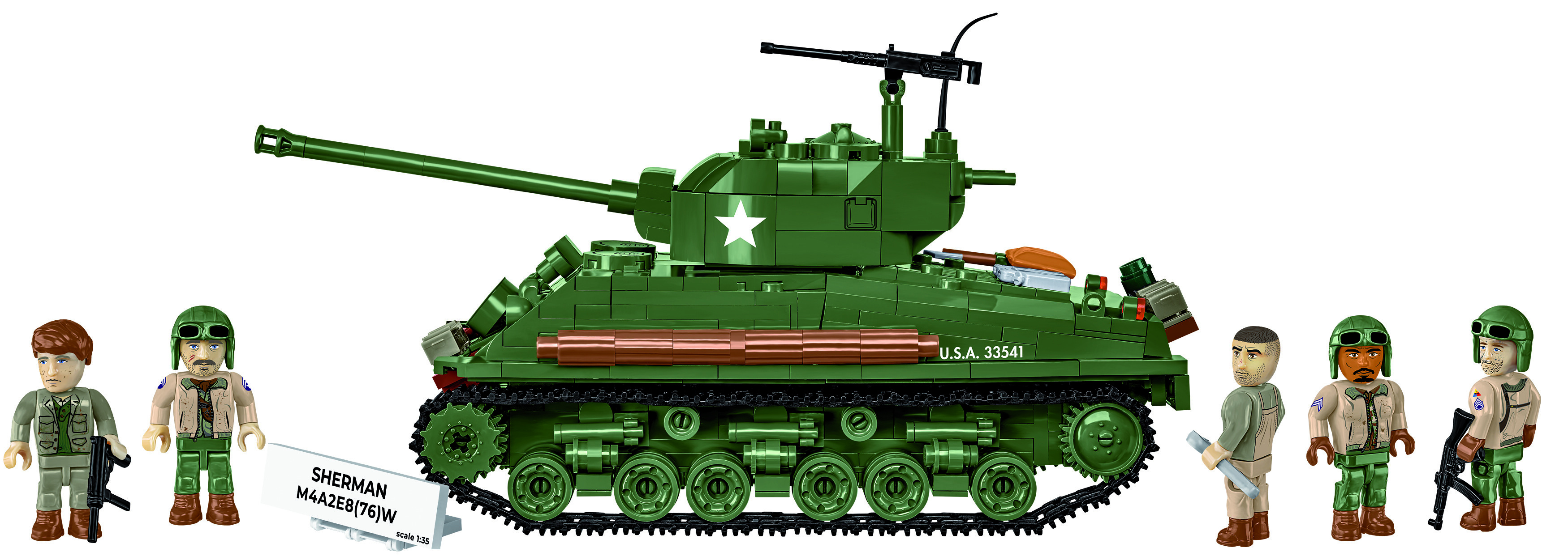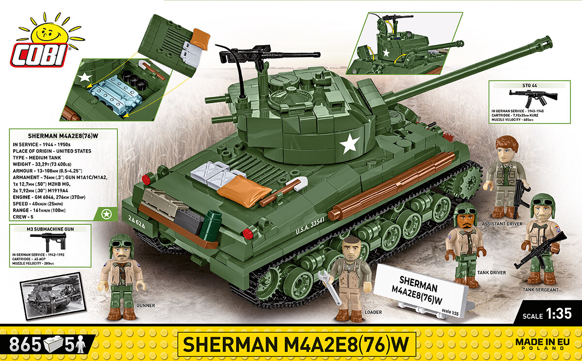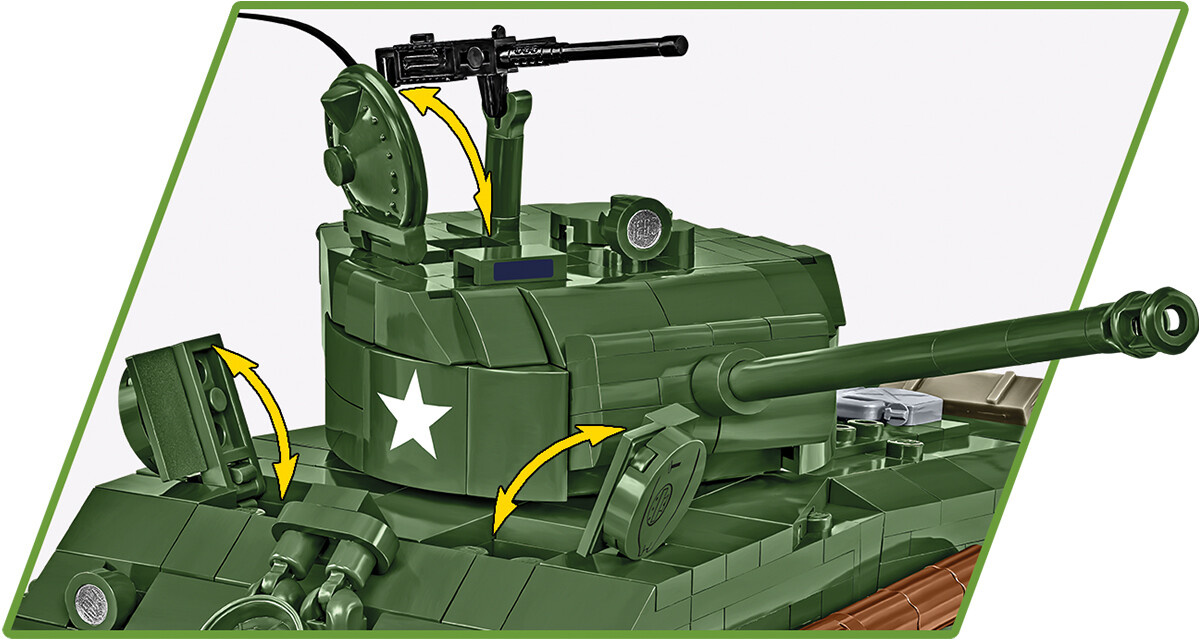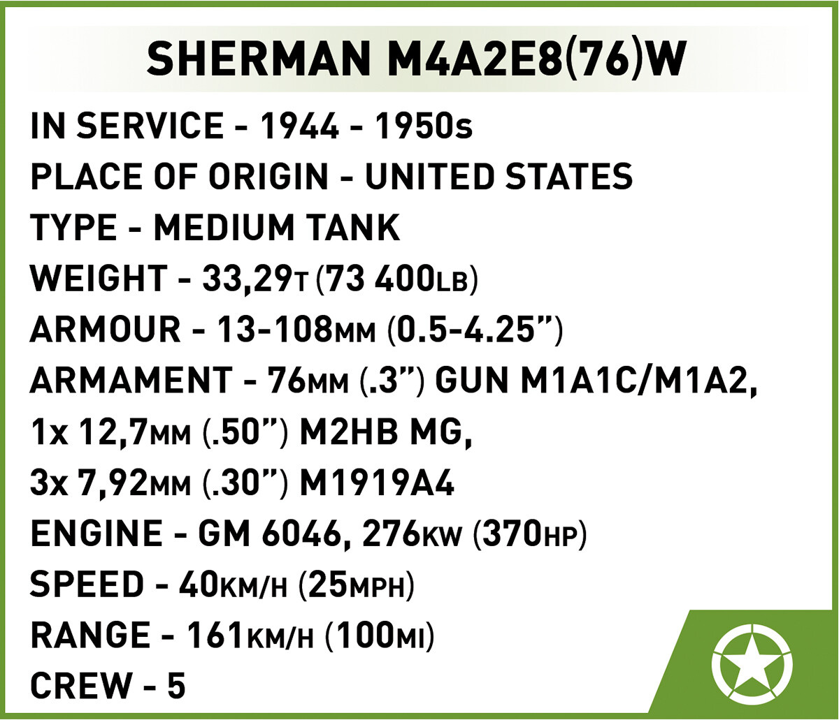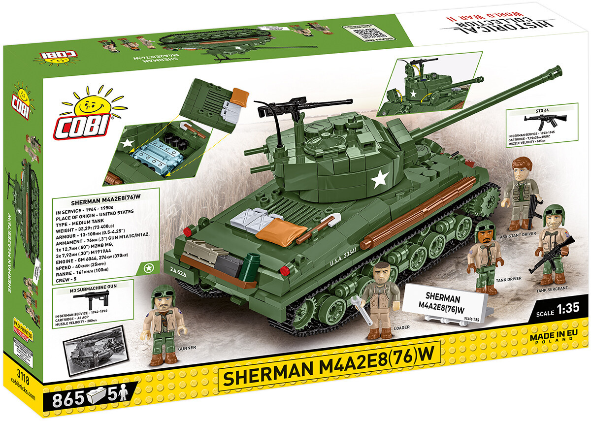 Sestavte si model amerického středního tanku M4A2E8 Sherman v měřítku 1:35, který je známý pod přezdívkou "Easy Eight". Stavebnice obsahuje 865 dílků a pět figurek posádky. Tento vylepšený typ legendárního Shermana měří 22,5 cm na délku, 10 cm na šířku a 12,5 cm na výšku byl uveden do služby ke konci druhé světové války. Tank se pyšní modernizovaným odpružením HVSS (Horizontal Volute Spring Suspension) a 76mm kanónem, což mu zajišťovalo lepší stabilitu a přesnější střelbu. Díky vylepšenému pancéřování a zvýšené mobilitě se "Easy Eight" osvědčil v soubojích s německými středními tanky. Jednoduchá konstrukce navíc usnadňovala jeho výrobu a údržbu.