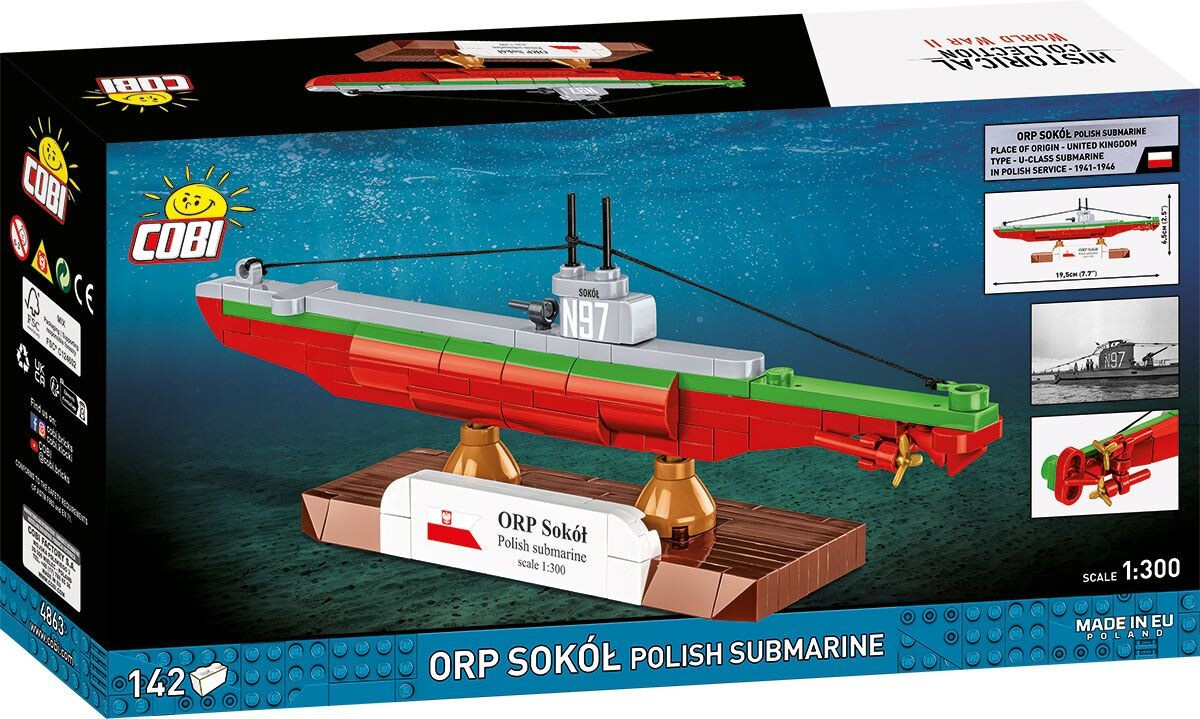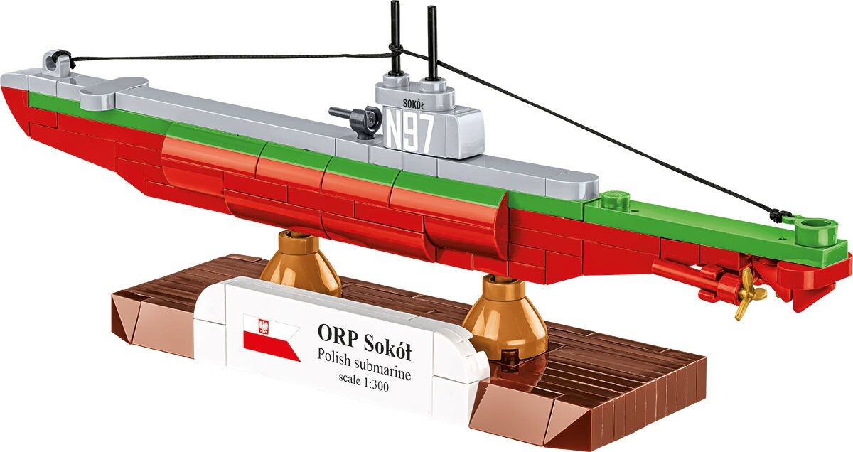 Postavte si ORP Sokół, legendární polskou ponorku z období druhé světové války, která se proslavila svou odvahou a mimořádnou bojovou účinností. Tento model v měřítku 1 : 300 obsahuje 142 kostek a po sestavení dosahuje rozměrů 19,5 cm na délku, 6,5 cm na šířku a 4 cm na výšku. Věrně zachycuje charakteristickou siluetu ponorky a je doplněn sběratelským podstavcem s tabulkou. Veškeré detaily jsou provedeny pomocí trvalých potisků bez použití samolepek. Model vznikl ve spolupráci s Muzeem námořnictva v Gdyni, což zaručuje vysokou historickou přesnost.