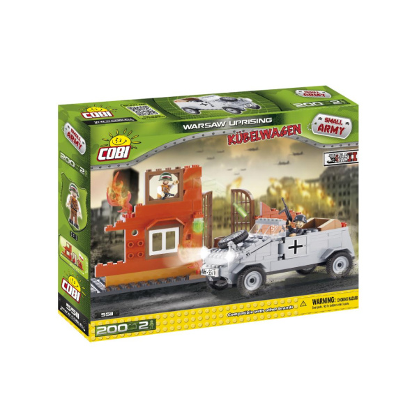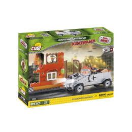 Popis produktu Cobi 5511 VW typ 82 KübelwagenSestava se skládá z 200 dílků a obsahuje 2 postavy – povstalce a důstojníka Wermachtu. Sada zahrnuje: model Kübelwagenu s rozměry 152 mm x 72 mm x 70 mm Ruiny s rozměry 208 mm x 96 mm x 119 mm blokovou repliku zbraní – kulomet MP 40 a ruční pistole VIS wz.35 dílky, svítící ve tmě COBI SA, ul. Jaskrów 11, 04-709 Warszawa, Polsko, kontakt@cobi.pl