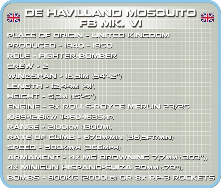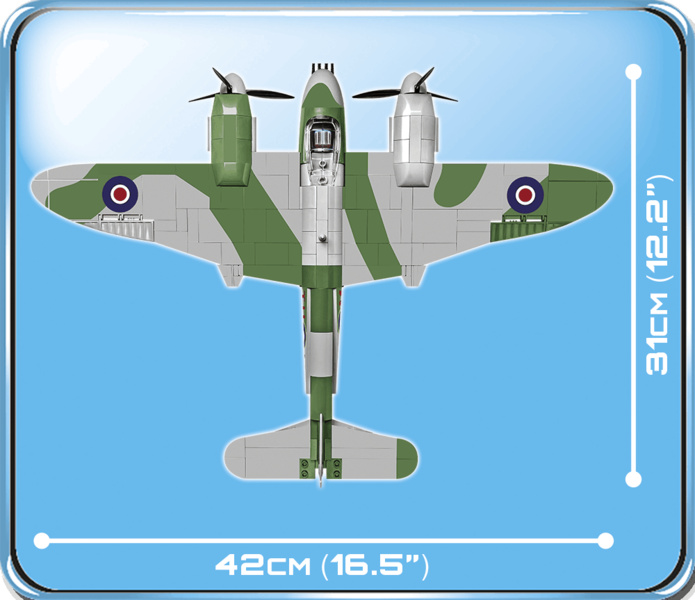 Postavte si víceúčelový britský letoun De Havilland Mosquito z druhé světové války. Model o délce 31 cm a rozpětí křídel 42 cm disponuje sklopným podvozkem a dalšími pohyblivými částmi. Stavebnice obsahuje 452 kostek a figurku britského pilota.