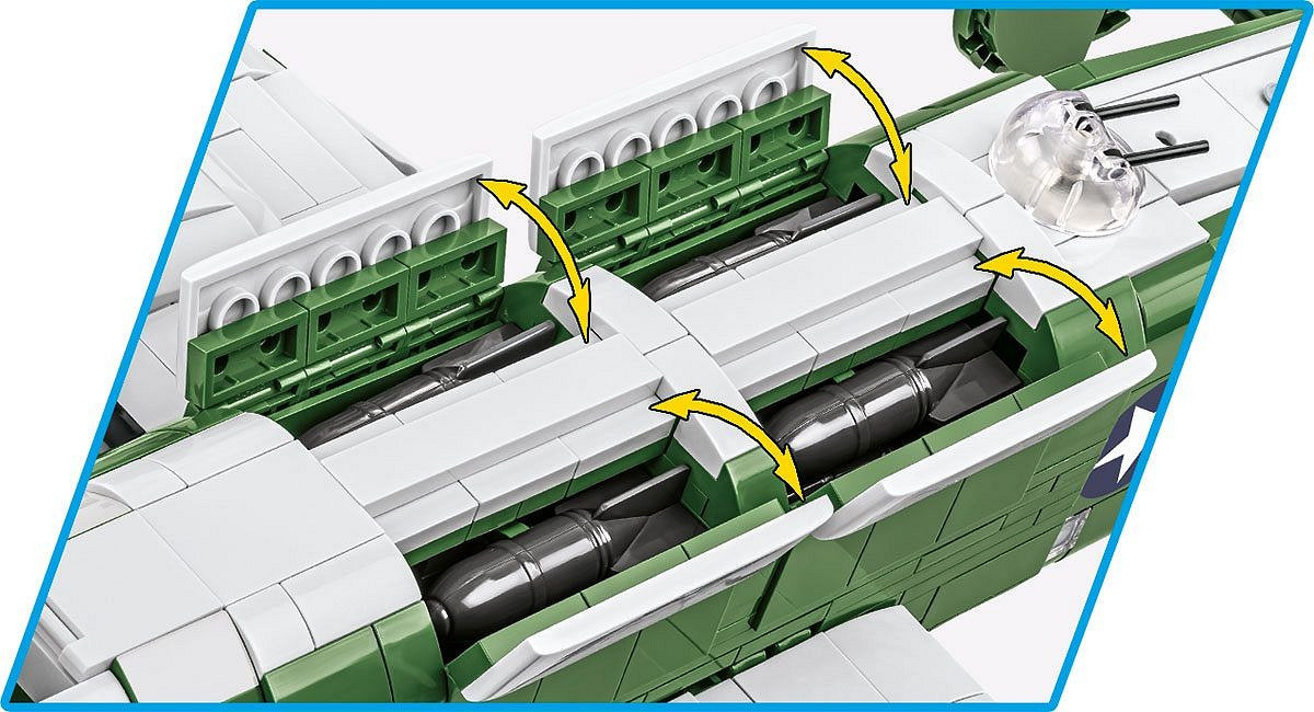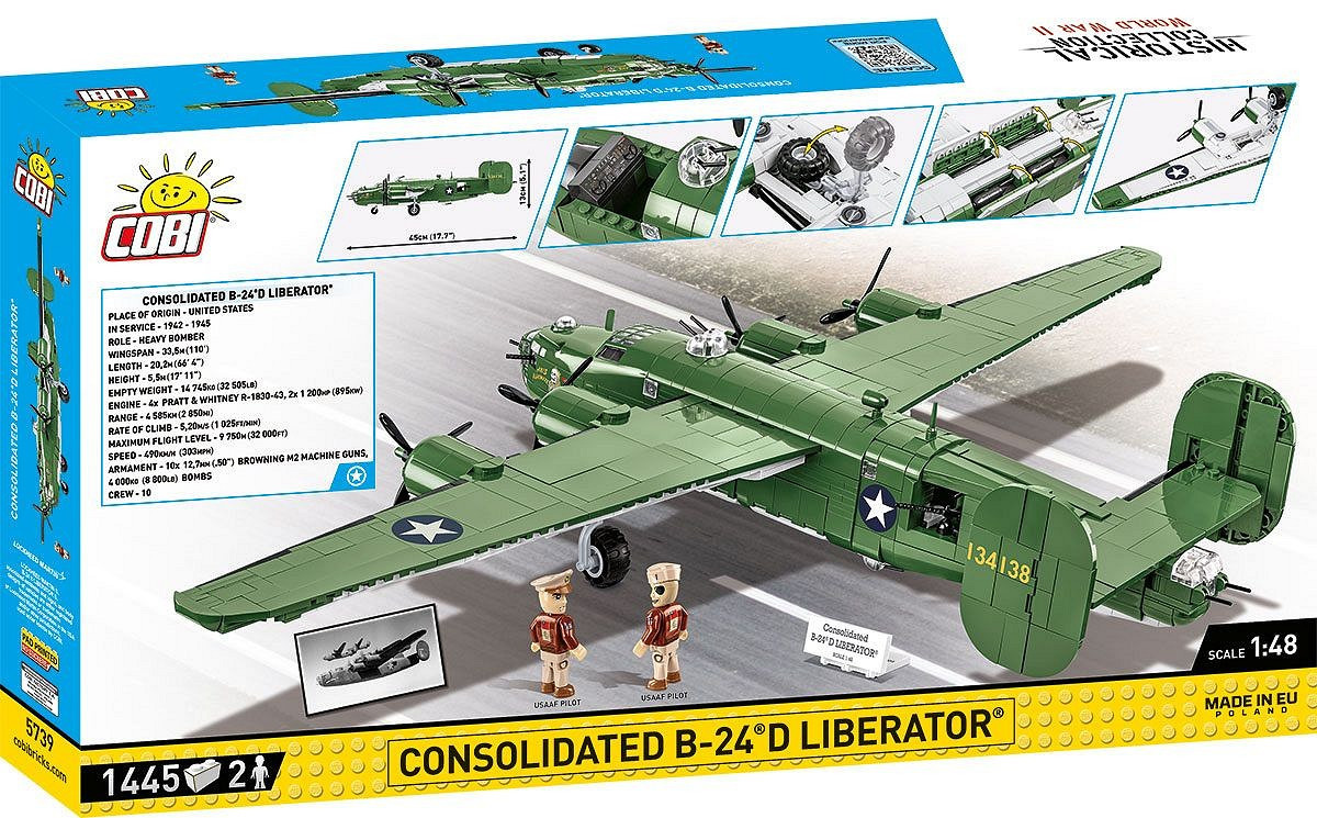 Postavte si model čtyřmotorového bombardéru Liberator v měřítku 1:48. Sestavený model se skládá z 1445 prvků a měří 45 cm na délku, 13 cm na výšku a má rozpětí křídel 68,5 cm. V odnímatelném kokpitu jsou dvě figurky amerických pilotů opatřené detailními potisky na přední i zadní straně, které dokonale imitují uniformy letců v tichomořské oblasti. Model má řadu pohyblivých prvků, jako jsou otočné vrtule, křidélka, zasunovací podvozek a otevíratelná pumovnice. Stavebnice je vybavena i štítkem s názvem letounu.