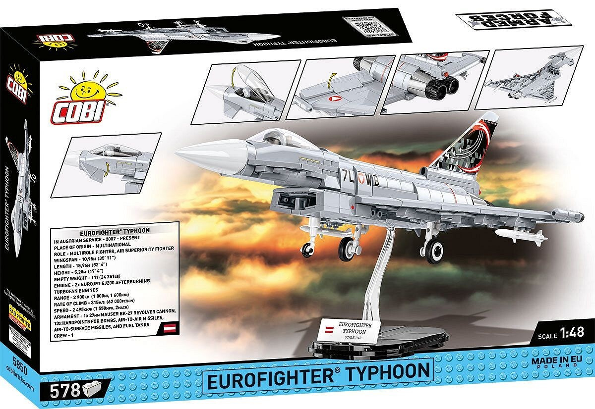 Postavte si model víceúčelové proudové stíhačky Eurofighter v měřítku 1:48. Model má vyklápěcí kryt kokpitu pro usazení speciálně upravené figurky pilota, nastavitelné řídící plochy a podvěšené rakety AIM-9. Sestavený model se skládá ze 578 dílků a měří 34,5 cm na délku, 24 cm na šířku a 11,8 cm na výšku.