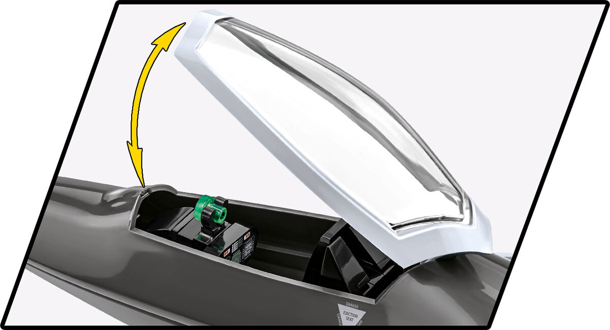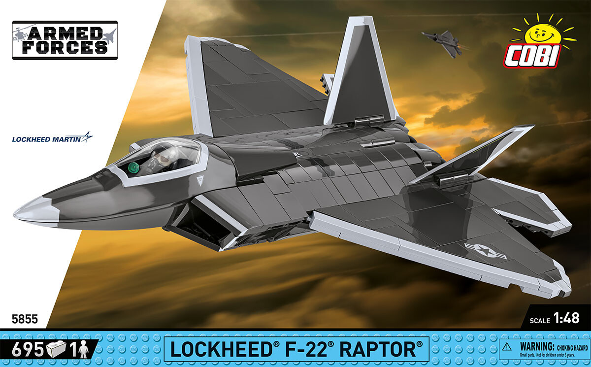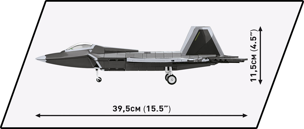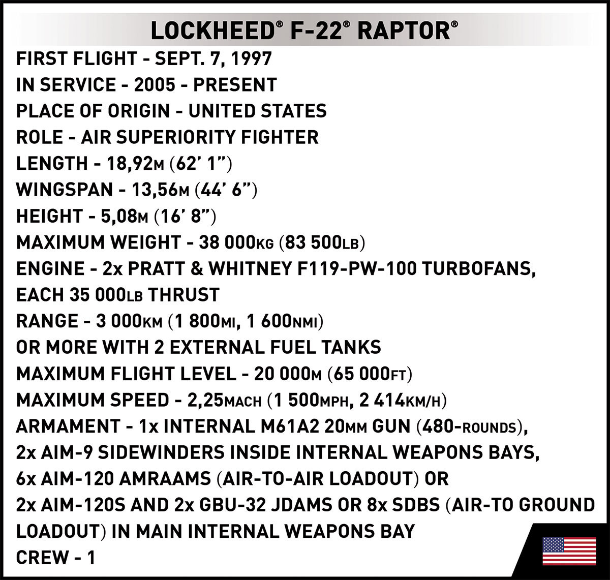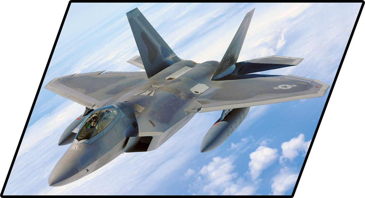 Postavte si model víceúčelového amerického letounu 5. generace Lockheed F-22 Raptor v měřítku 1:48. Sestavený model se skládá z 695 prvků a měří 39,5 cm na délku, 11,5 cm na výšku a má rozpětí křídel 28 cm. Pro potřeby této sestavy byly vyvinuty zcela nové prvky charakteristické pro F-22, jako je příď letounu s kabinou nebo vertikální stabilizátory. Model je dokonale zpracovaný a hladký jako jeho skutečný protějšek s technologií STEALTH. Sada obsahuje otevírací kabinu, do které můžeme umístit detailní figurku pilota s kyslíkovou maskou. Podvozek letadla lze snadno demontovat a model lépe vystavit na přiloženém stojanu, jehož součástí je také štítek se jménem letadla a vytištěnou vlajkou USA. V otevírací pumovnici jsou řízené střely.