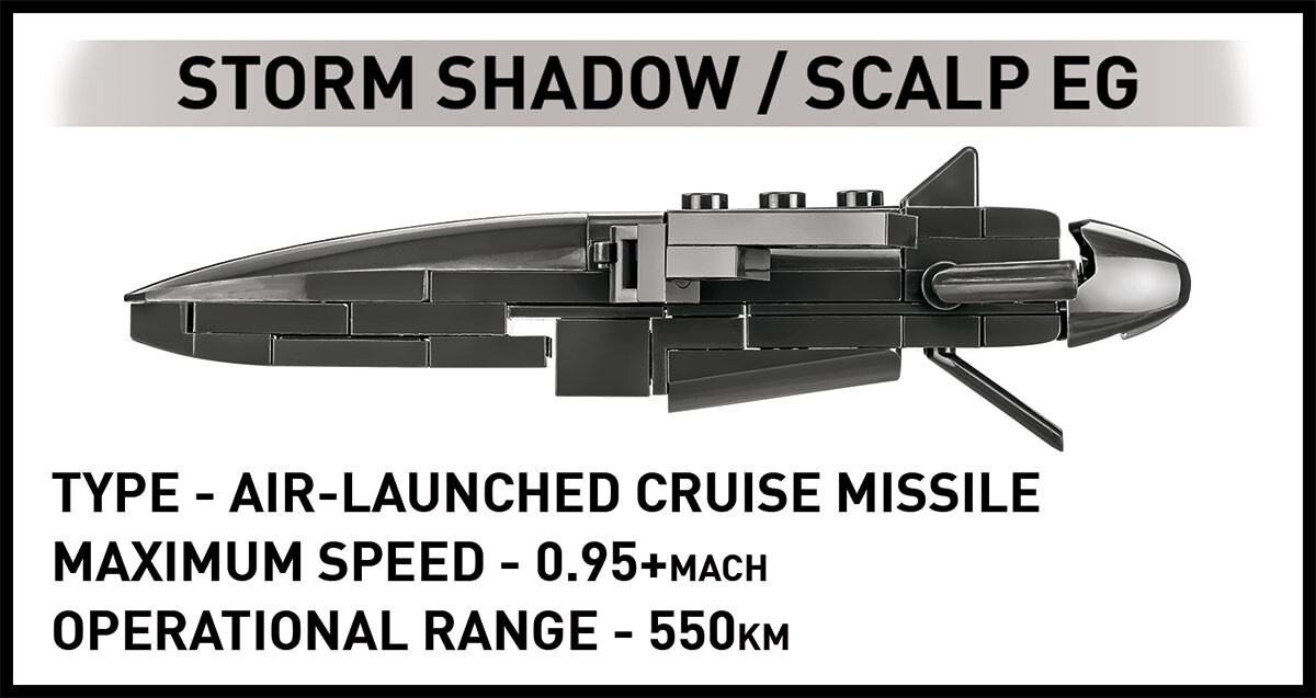 Postavte si model amerického stíhacího letounu F-16 v měřítku 1:48. Sestavený model o rozměrech 31 cm na délku, 22 cm na šířku a 11,5 cm na výšku je vybaven podvěšenými řízenými střelami Storm Shadow, přičemž výzbroj je odnímatelná. Stavebnice se skládá z 500 dílků. Součástí balení je také figurka ukrajinského pilota vybavená helmou a kyslíkovou maskou s hadicí.