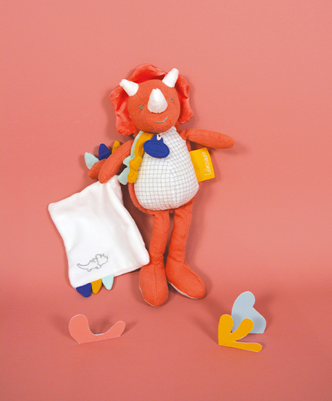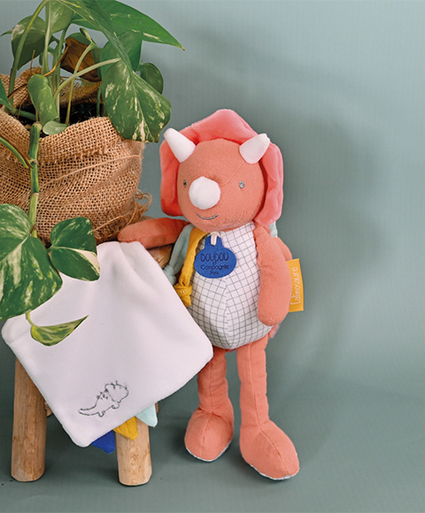 Plyšový dinosaurus s dečkou doprovází miminko od narození, aby mu přinesl hebkost, pohodlí a objetí. Rozvíjí smysly a zvědavost. Je to velmi pěkný dárek k Vánocům nebo k oslavě narození miminka. Prezentováno v pěkně ladící krabičce.