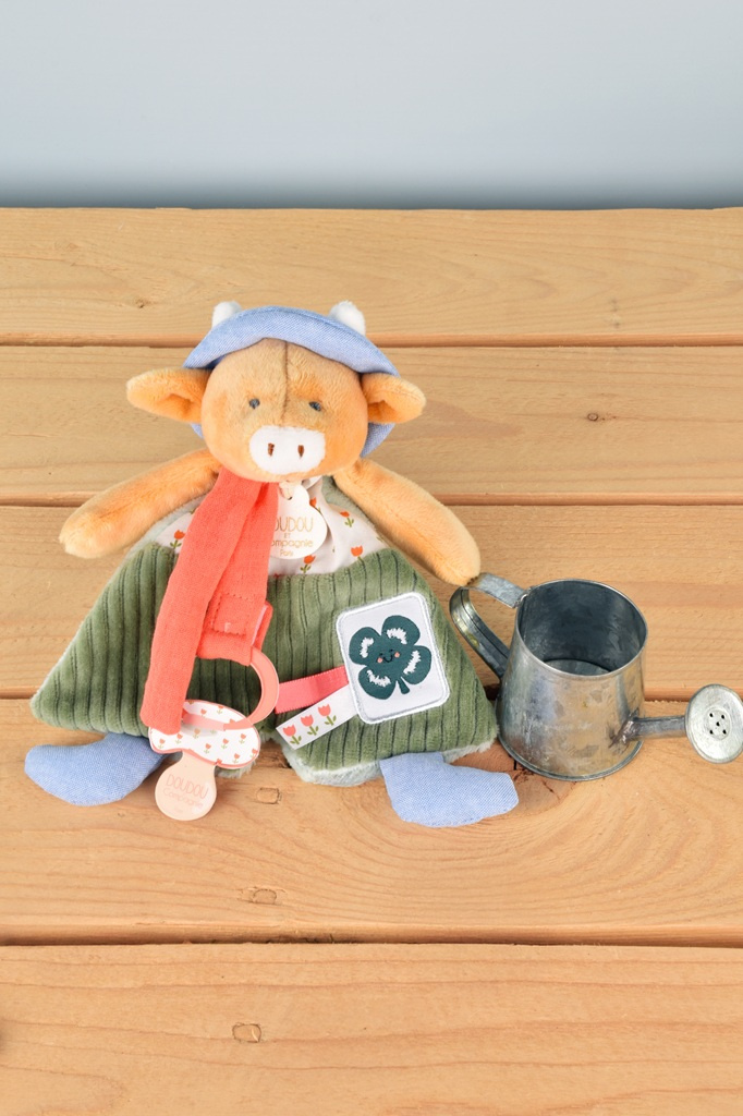Kravička Anette o velikosti 19 cm z kolekce „Moje zahrada“ je roztomilá hračka s praktickým integrovaným úchytem dudlíku. Je oblečena do zeleného manšestrového oblečku s květovaným límečkem. Různé textury vybízejí ke zkoumání a mačkání a dítě zabaví i uklidní. Hračka je zabalena v pěkné dárkové krabičce pro uložení vzpomínek (fotografie a další připomínky narození miminka) s veršovaným textem v angličtině na spodní straně. Ideální dárek pro jakoukoliv příležitost.
