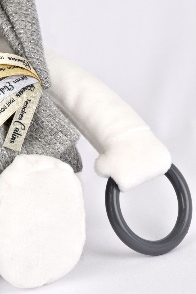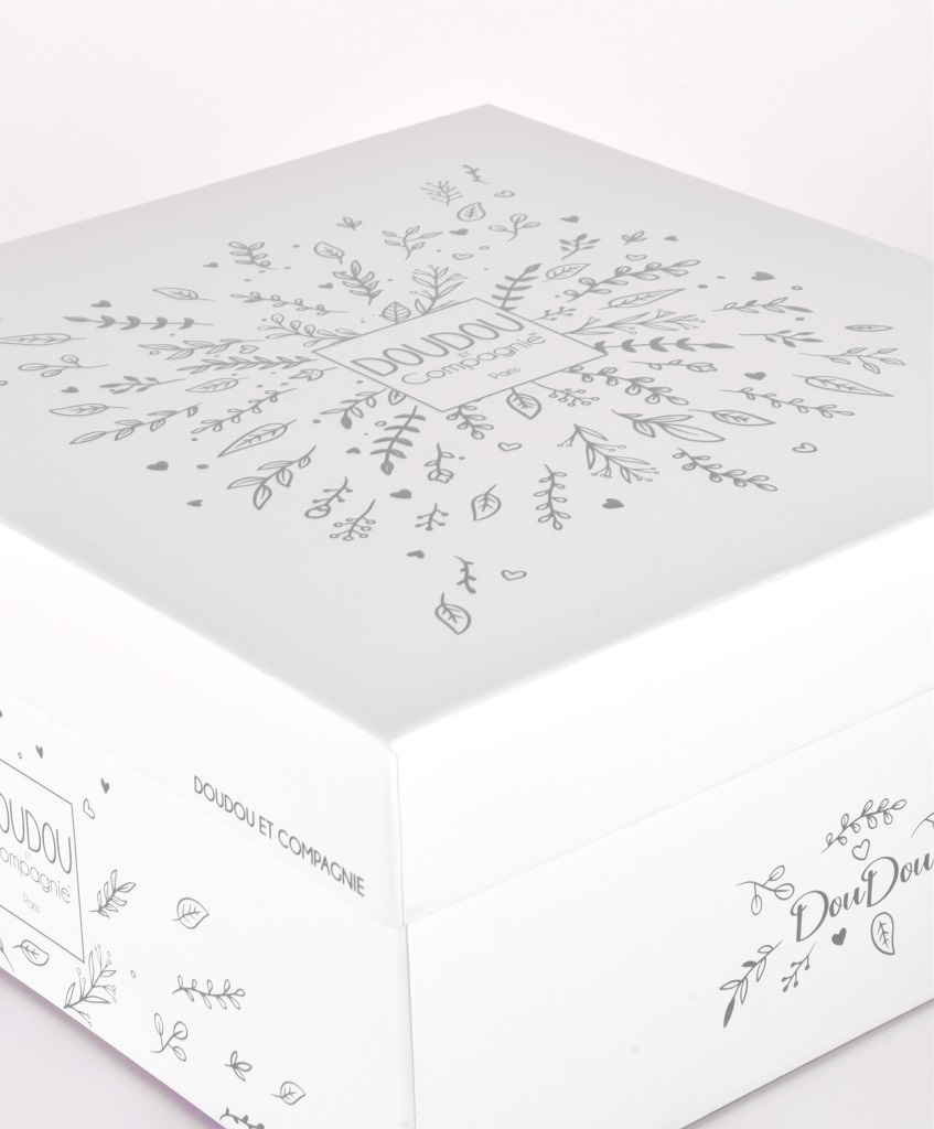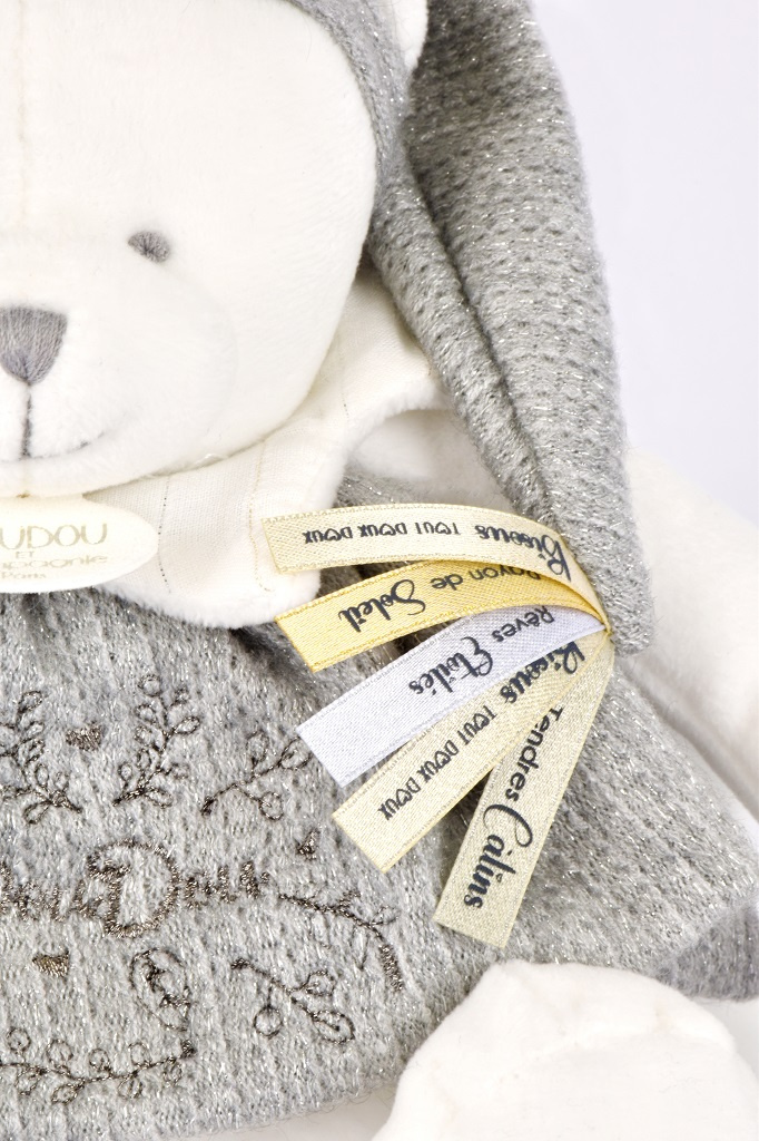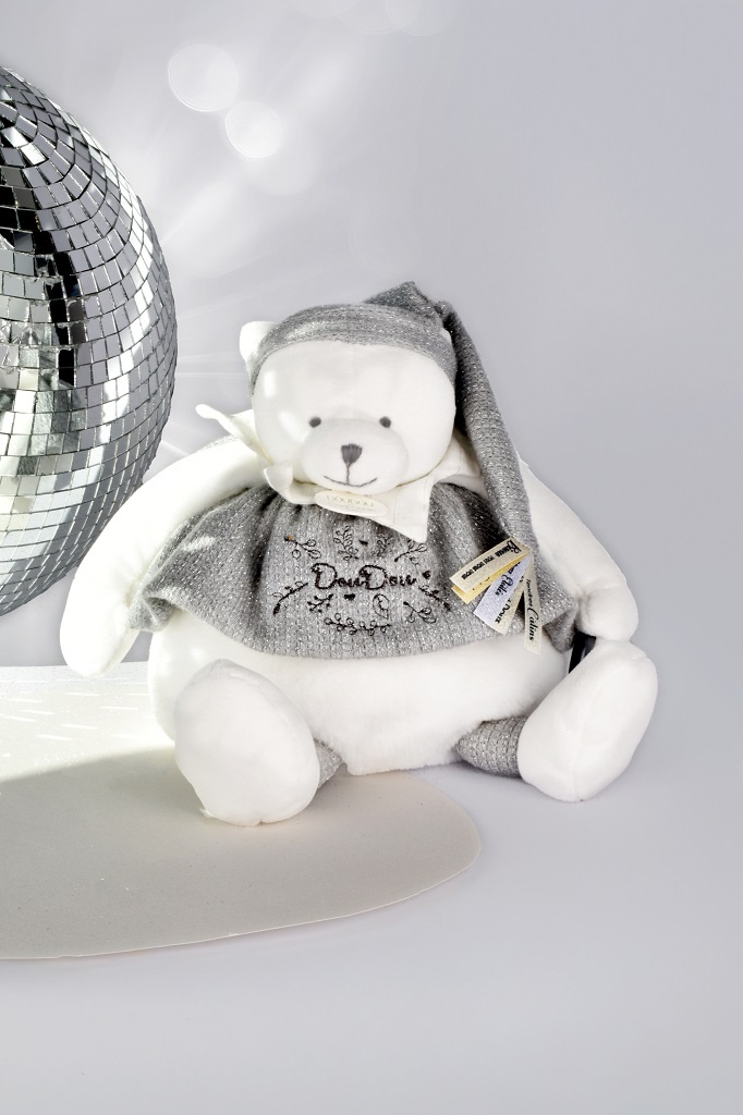Plyšové mládě ledního medvídka je ideálním dárkem pro děti již od narození. Je navržen tak, aby jemně stimuloval smysly miminka a podporoval jeho přirozenou zvídavost. Medvídek má šedou čepičku zdobenou saténovými stuhami s láskyplnými vzkazy ve francouzštině, které každému mazlení dodávají ještě něžnější nádech. Tělíčko medvídka je vyrobeno z hebkého materiálu příjemného na dotek a zdobí ho jemná výšivka značky Doudou. Pro rozvoj smyslů a jemné motoriky nabízí medvídek spoustu podnětů – šustivý papír v tlapkách, plastový úchopový kroužek a chrastítko uvnitř tělíčka medvídka.
