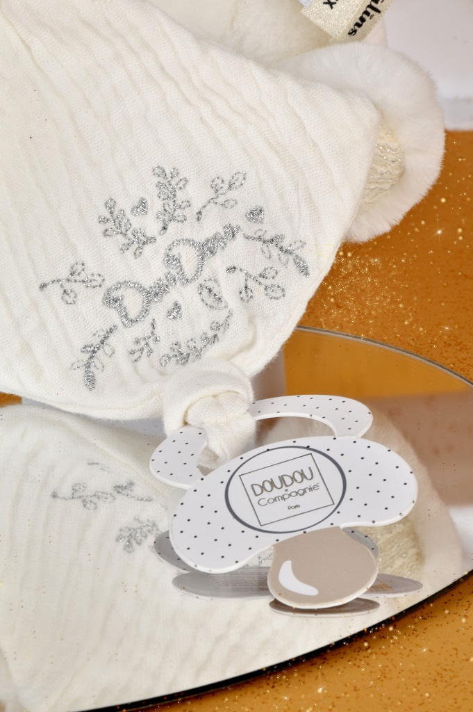 Tento plyšový medvídek je mnohem víc, než jen plyšová hračka. Kombinuje funkčnost a eleganci zároveň. Na tlapce má přišitou měkkou dečku, která je ideální k mazlení a může pomoci miminku lépe usínat. Na konci dečky se navíc nachází praktický úchyt na dudlík, takže bude vždy po ruce. Medvídek má na hlavě béžovou čepičku a pod krkem roztomilý bílý límeček a hebké tlapky s béžovými detaily, které mu dodávají něžný a přátelský vzhled. Jemné výšivky a ozdobné štítky přidávají na osobitosti a něžnosti, díky čemuž se stane věrným společníkem od prvních okamžiků Vašeho miminka.
