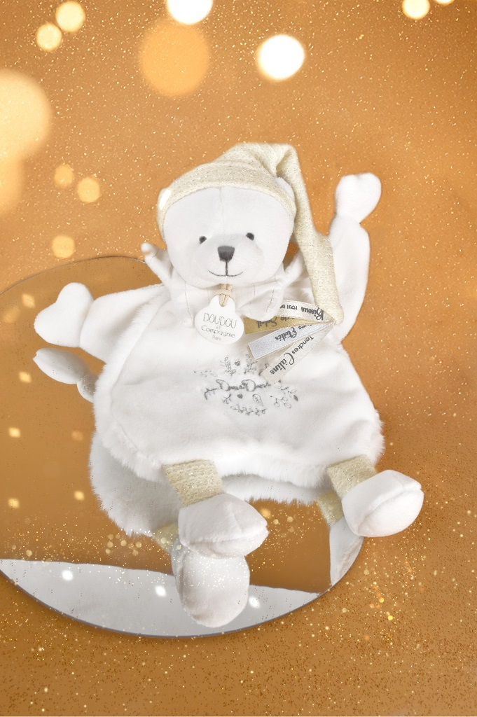 Plyšový muchláček medvídek je ideálním dárkem pro děti již od narození. Medvídek má na hlavě roztomilou béžovou čepičku a měkké bílé tlapky, které vypadají, jako by měl na nožkách malinké bačkůrky. Pod krkem má bílý límeček a na bříšku najdete jemnou šedou výšivku značky Doudou, která podtrhuje jeho něžný vzhled.