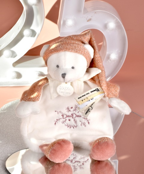 Plyšový muchláček medvídek je ideálním dárkem pro děti již od narození. Medvídek má na hlavě roztomilou růžovou čepičku a měkké růžové tlapky, které vypadají, jako by měl na nožkách malinké bačkůrky. Pod krkem má bílý límeček a na bříšku najdete jemnou růžovou výšivku značky Doudou, která podtrhuje jeho něžný vzhled.