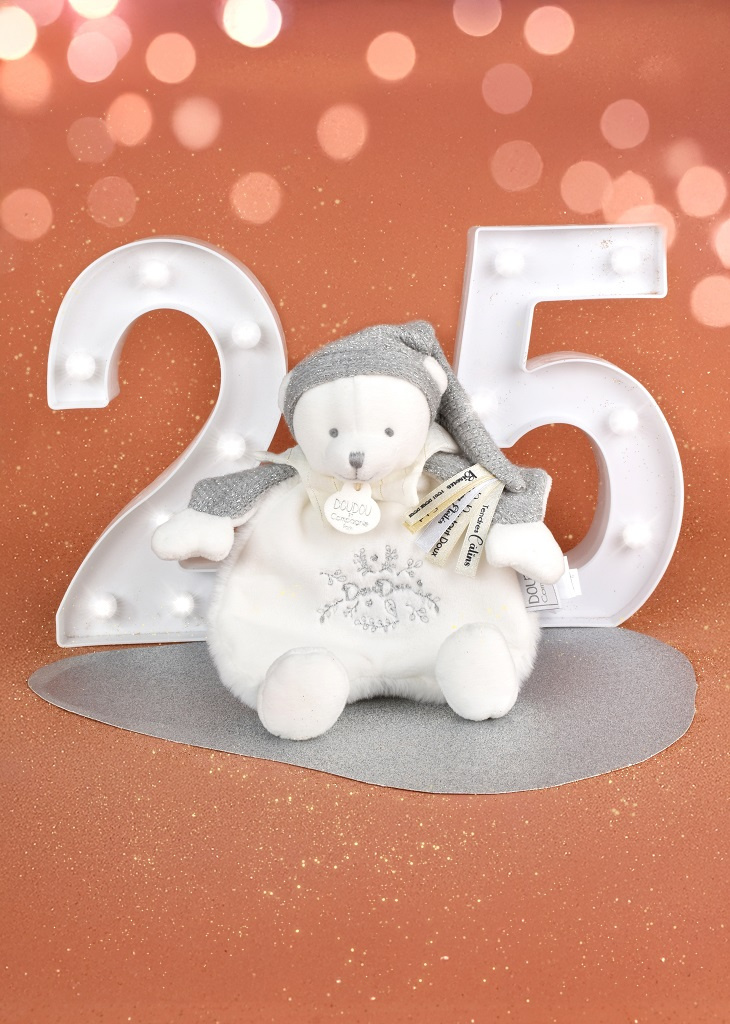 Plyšový muchláček medvídek je ideálním dárkem pro děti již od narození. Medvídek má na hlavě roztomilou šedou čepičku a měkké bílé tlapky, které vypadají, jako by měl na nožkách malinké bačkůrky. Pod krkem má bílý límeček a na bříšku najdete jemnou šedou výšivku značky Doudou, která podtrhuje jeho něžný vzhled.