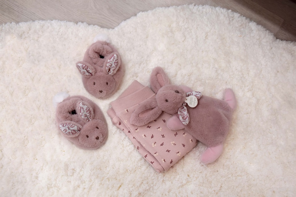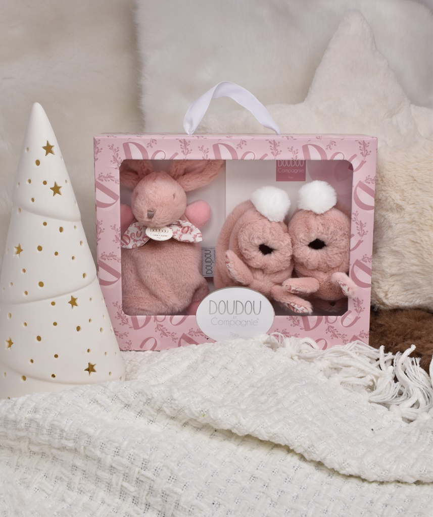 Sada roztomilého růžového zajíčka a měkkých plyšových botiček v dárkové krabičce jsou krásným dárkem pro každé dítě ve věku 0-6 měsíců. Botičky mají dlouhá ouška s potiskem a v přední části vyšitý obličej zajíčka a udrží dětské nožičky v teple díky hřejivému materiálu. Plyšový zajíček s elegantní mašlí pod krčkem doprovází miminko od narození a díky své jemnosti a měkkosti mu přináší pocit klidu a bezpečí, podporuje rozvoj smyslového vnímání a jemné motoriky. Zabaleno v dárkové krabičce s průhledem ozdobené ladícím potiskem.