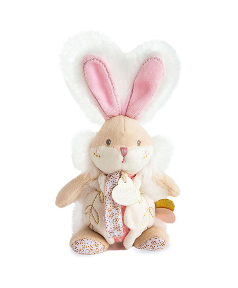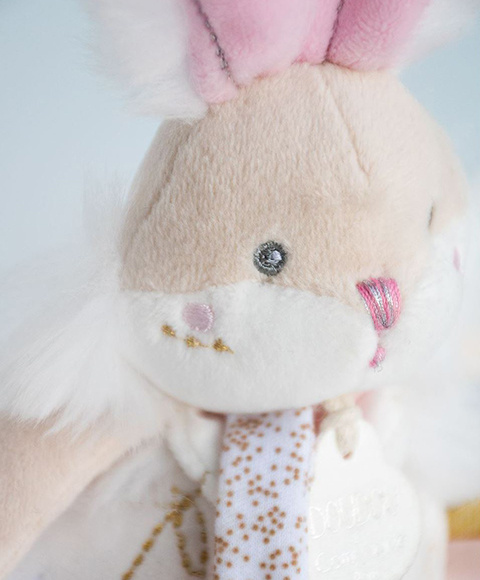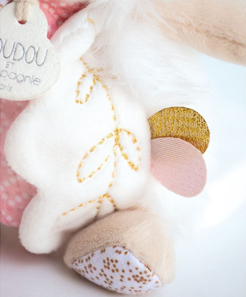 Něha, pastelové barvy a spousta rafinovanosti je tento králíček s chrastítkem a také držákem dudlíku. Doprovází miminko od narození, aby mu přinesl hebkost, pohodlí a také držel dudlík v jeho blízkosti. Rozvíjí smysly a zvědavost. Je to velmi pěkný dárek k Vánocům nebo k oslavě narození miminka. Je extrémně měkký a příjemný na dotek.