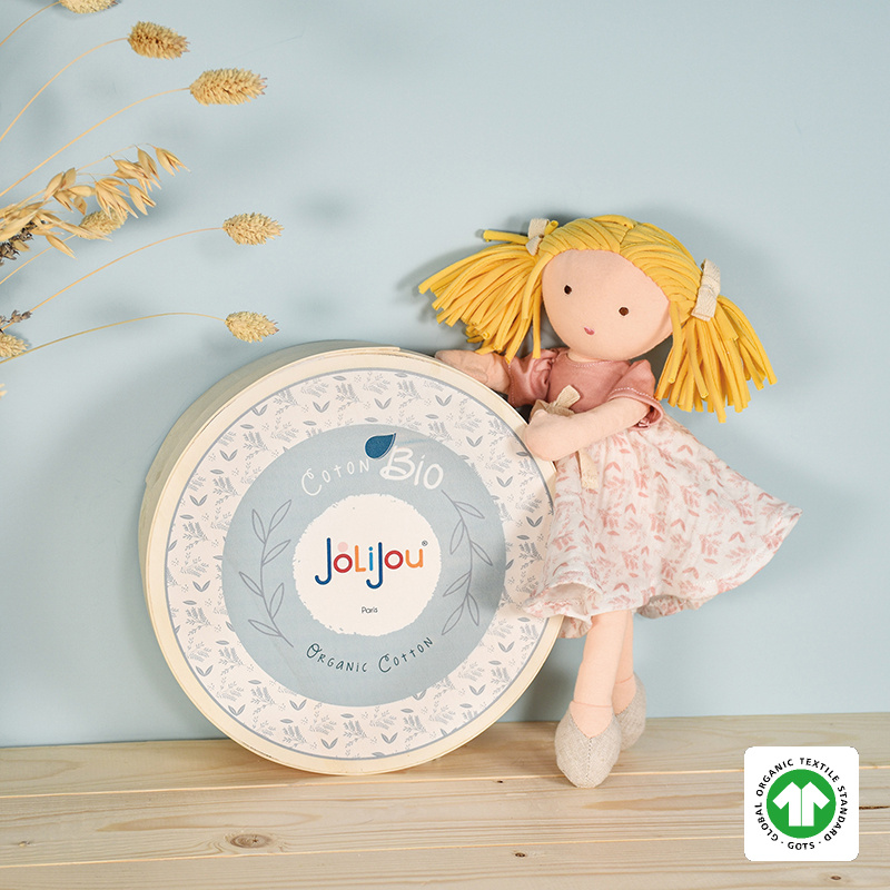 Tato malá roztomilá panenka jménem Camélia je vyrobena z organické bavlny a její výplň jsou 100% recyklovaná polyesterová vlákna. Panenka má na sobě žerzejové tričko a zavinovací sukýnku s květinovým vzorem v růžové barvě, která jemně ladí s jejími mašličkami. Panenka je dodávána v krásné kulaté dárkové krabičce z přírodního dřeva. Hračka splňuje evropské bezpečností CE normy.