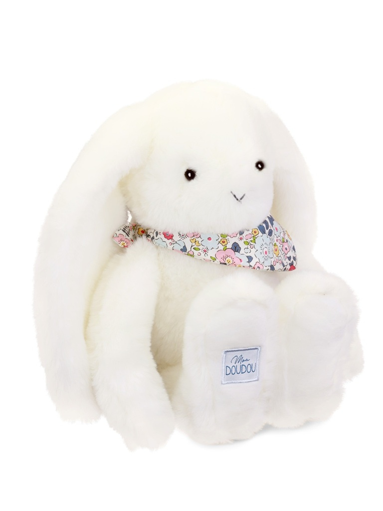 Heboučký bílý králíček o velikosti 35 cm s květovaným šátkem má přátelský obličej, dlouhá ouška a doprovází miminko od narození po celé dětství, aby mu přinesl pocit pohodlí a bezpečí. Díky barevnému provedení v jemných barvách a prémiovému hebkému materiálu vybízí k tulení a muchlání a dítě zabaví i uklidní. Přispívá k rozvoji smyslového vnímání, jemné motoriky a je roztomilým pomocníkem pro klidné usínání. Ideální dárek pro jakoukoliv příležitost.