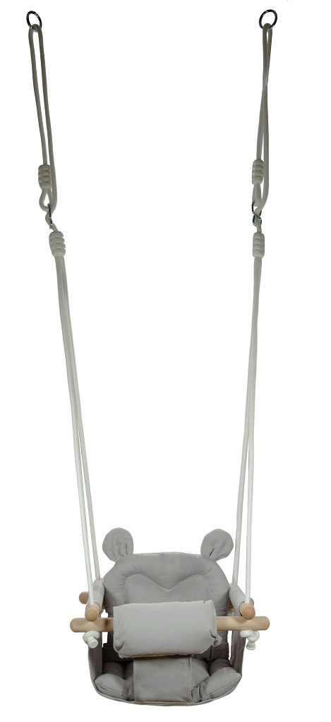Komfort, bezpečí, zábava... méďa přesně ví, co spokojená miminka potřebují! Tato dětská houpačka nabízí nejen spousty hodin legrace, ale i aktivní odpočinek. Konstrukce z bukového dřeva a sedátko ze 100% bavlny zajišťují plné pohodlí a bezpečnost při houpání. Lana se 2 karabinami jsou výškově nastavitelná (až 180 cm). Konec lan je zakončen plastovou pojistkou proti jejich rozvázání. Díky tlumeným barvám a jednoduchému designu je houpačka také brilantním doplňkem do pokojíku!