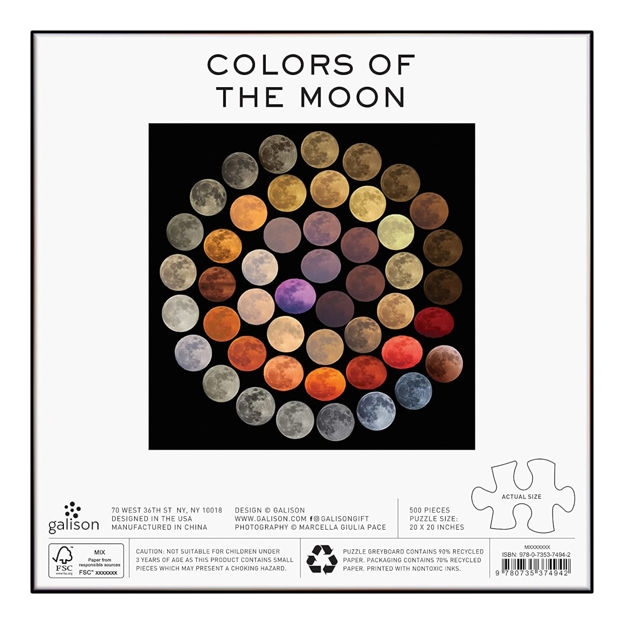 Puzzle Galison jsou vyrobeny za použití významného podílu recyklovaného papíru a nabízí špičkový potisk nezávadnými barvami. Jsou opatřeny matnou povrchovou úpravou, která zajišťuje za všech okolností věrné podání detailů i barev. Jejich zadní strana je potažena hladkým, na dotek příjemným povrchem, díky němuž se při skladování rozloženého puzzle netvoří prach.