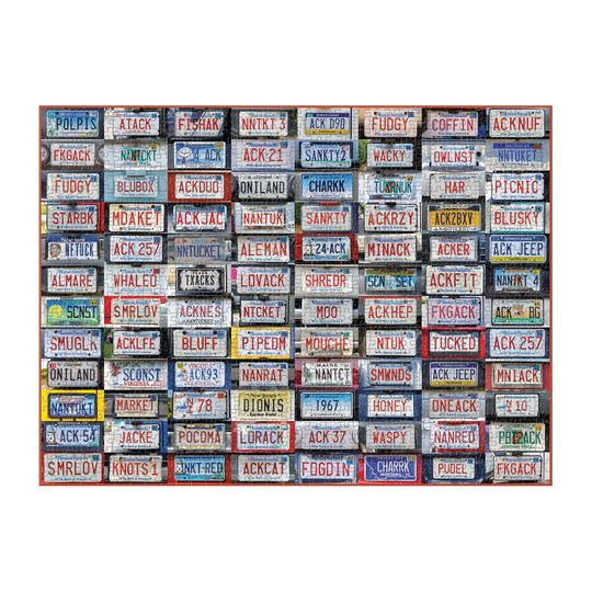 Koláž SPZ je 1000 Pdílné puzzle obsahuje 96 fotografií poznávacích značek. Ať už rozumíte významům písmen a slov na těchto poznávacích značkách nebo ne, každému se bude líbit skládání značky s nápisem FISHAK, FUDGY, MOUCHE, POLPIS, HONEY a další! Puzzle jsou baleny v pevných krabicích s matným povrchem. Umělec James Ogilvy.