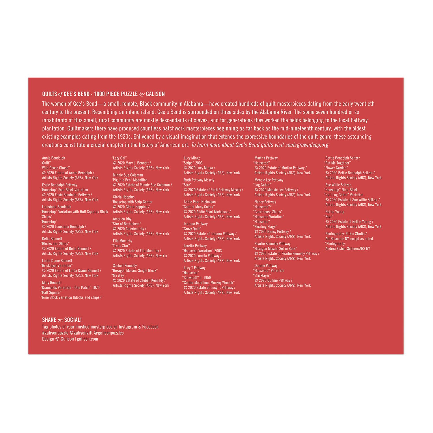 Patchworkové deky Gee’s Bend je 1000dílné puzzle se 40 barevnými vzorovanými dekami. Tyto deky byly vytvořeny ženami z Gee’s Bend, malou a izolovanou skupinou afroamerických žen v okrese Wilcox County v Alabamě. Tato světoznámá skupina vyrobila stovky patchworkových dek a to od raného 20. století až do současnosti. Puzzle Galison jsou zabaleny v matných, pevných krabicích, jsou perfektní jako dárek. Můžete ji také použít jako úložný prostor. V balení také obrázek plně sestaveného puzzle jako předloha.