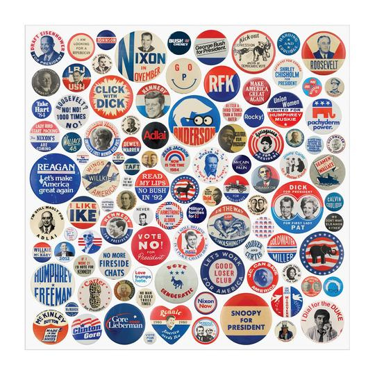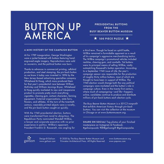 500 dílné rodinné puzzle zobrazuje fotografii placek politické kampaně z americké historie. Puzzle je baleno v pevných krabicích s matným povrchem. Umělec Busy Beaver Button MuseumÊ.