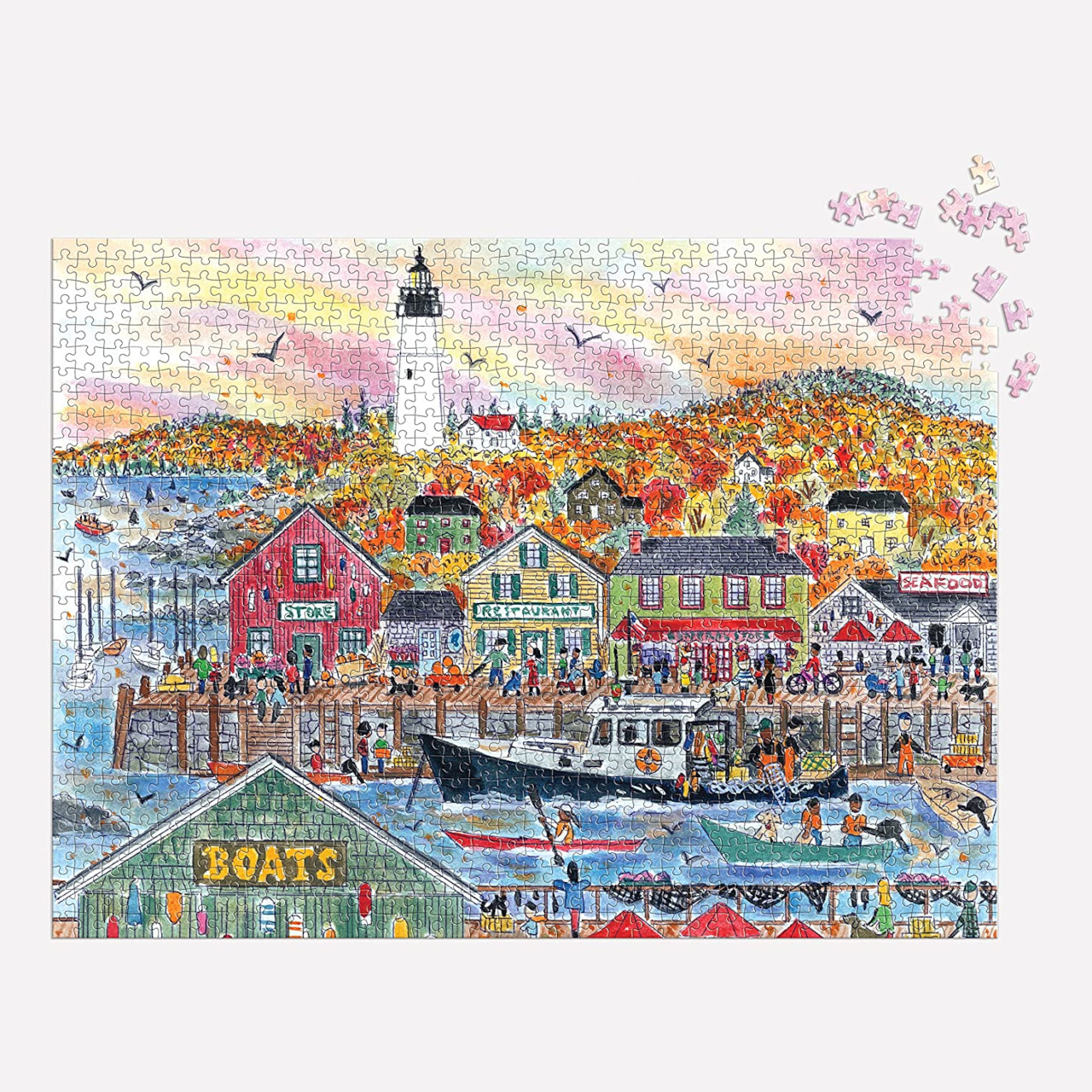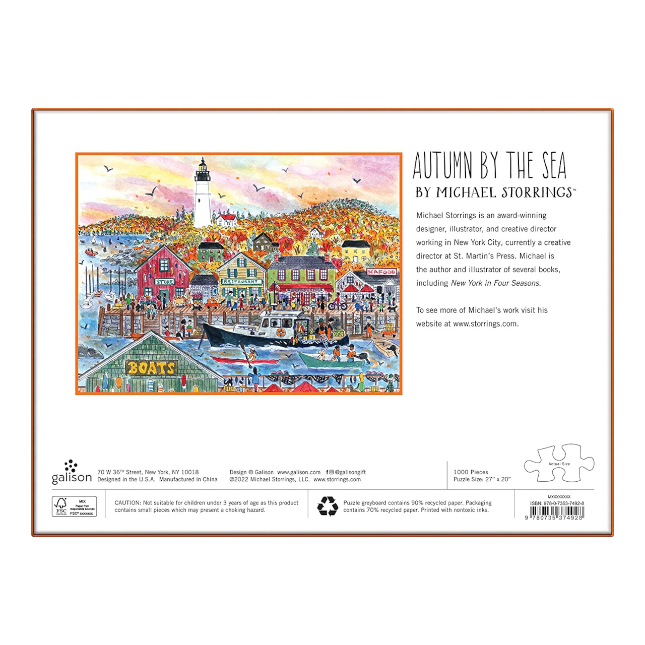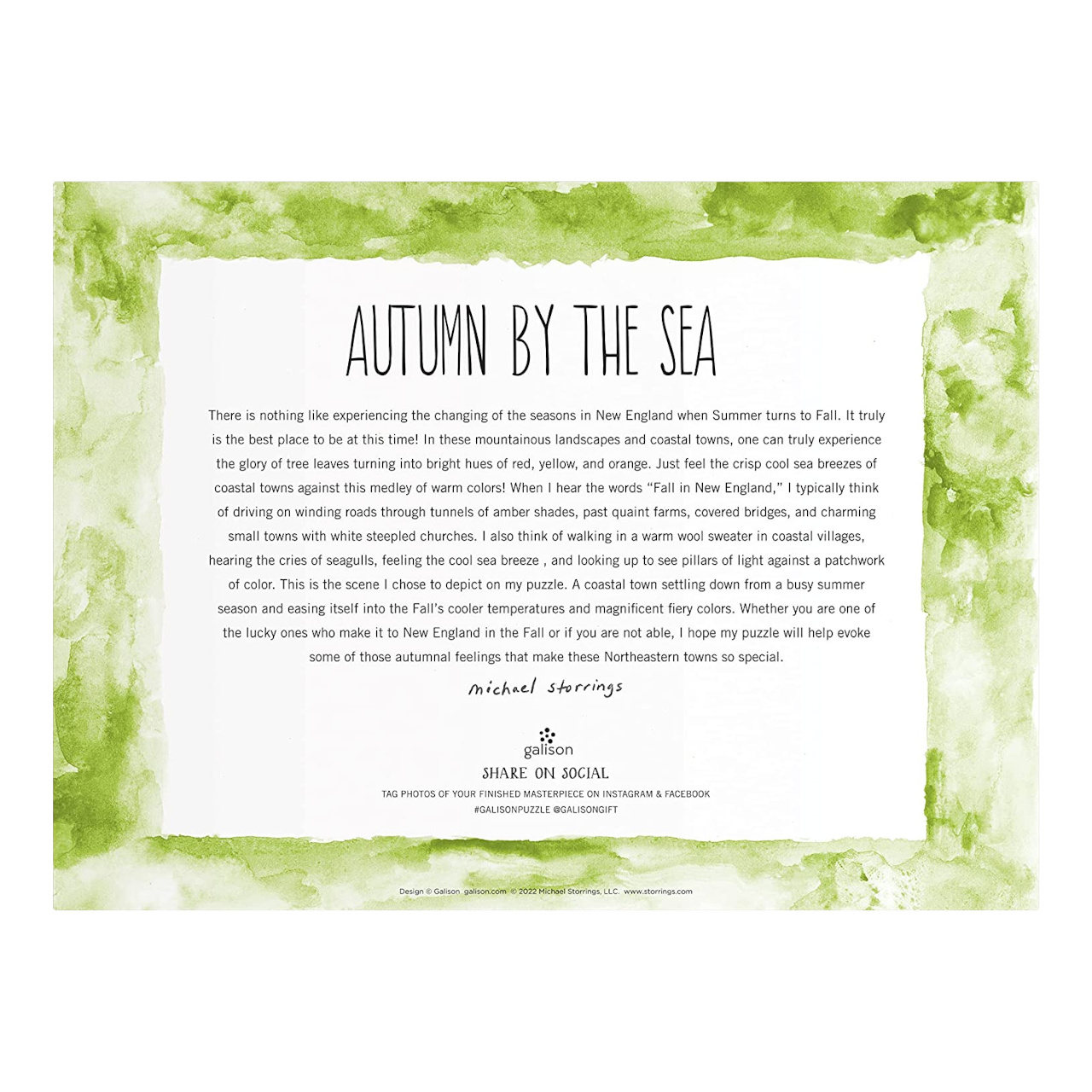 Přáli byste si zažít první podzimní dny v přímořském městečku v Nové Anglii? S jedinečným puzzle můžete kouzelnou atmosféru tohoto období a místa mít doma! Hřejivé odstíny červené, oranžové a žluté Vám pomohou se příjemně uvolnit a nechat se unášet vlastní fantazií. Autorem obrázku je cenami ověnčený designér a ilustrátor Michael Storrings.