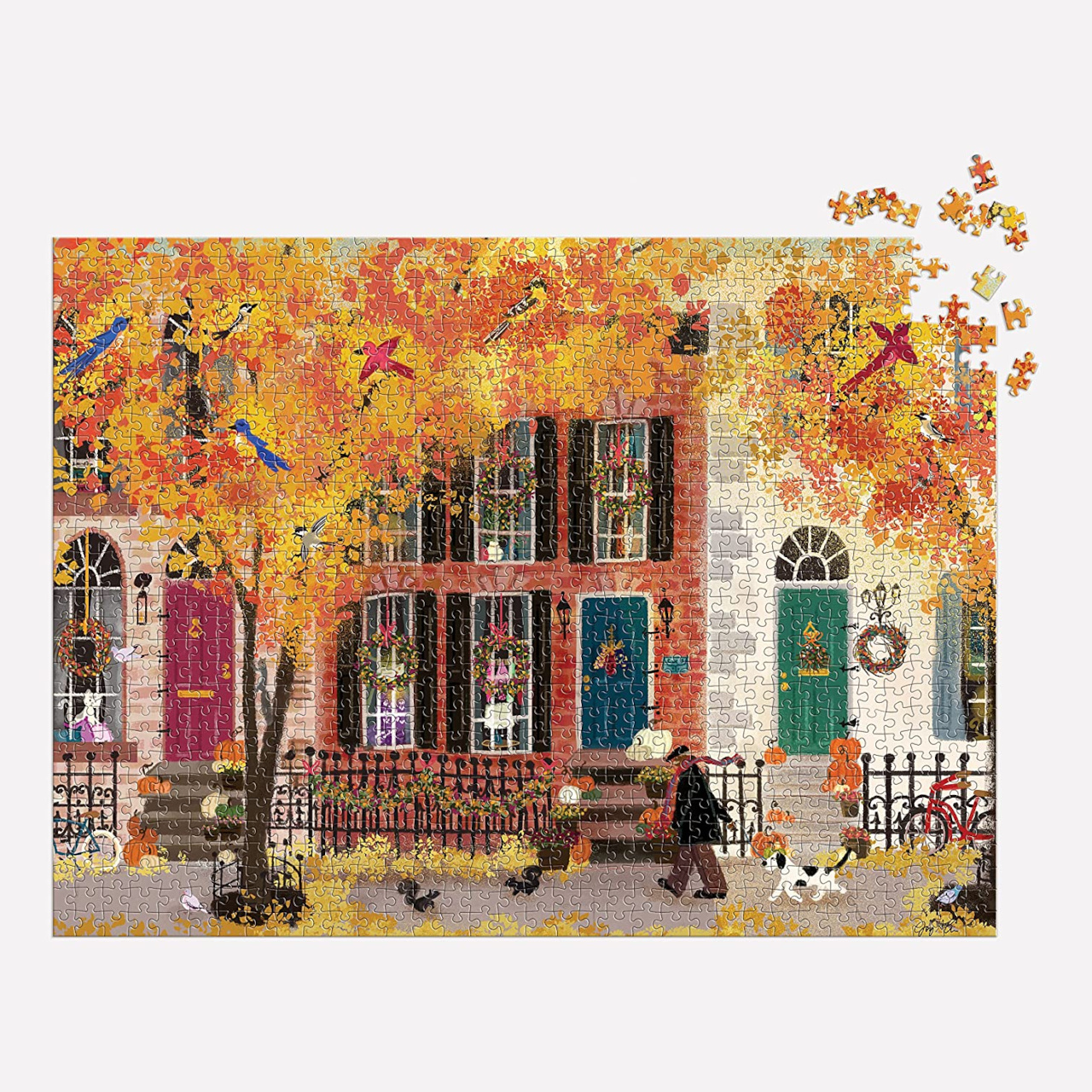 Do města zavítal podzim, ulicemi se prohání svěží vítr a rozechvívá pestrobarevné listí na stromech. Skvělá příležitost vyzkoušet nový svetřík, nebo šál a vyrazit na procházku čtvrtí. Připomínejte si náladu podzimních toulek s originálním puzzle! Autorem obrázku je americká ilustrátorka Joy Laforme.