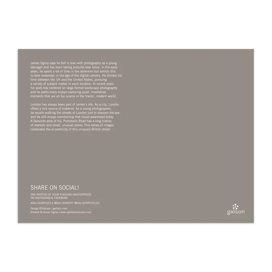 Portobello Road je oblíbené místo fotografa Jamese Ogilvyho. Složené puzzle zobrazuje výstřednost této jedinečné londýnské ulice s dlouhou historií trhů a malých neobvyklých obchodů. Puzzle je baleno v pevné krabici, pro opětovné použití a skladování. Ideální jako dárek. Autorem obrázku je James Ogilvy.