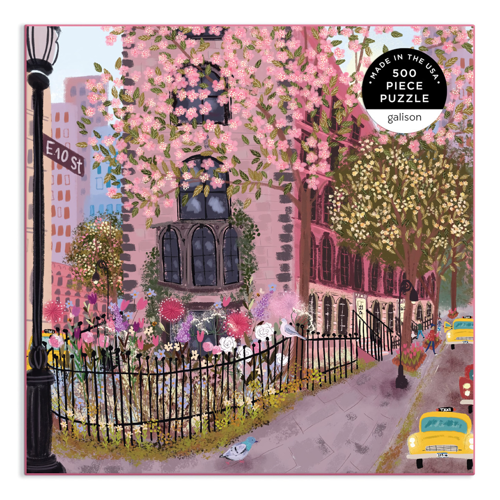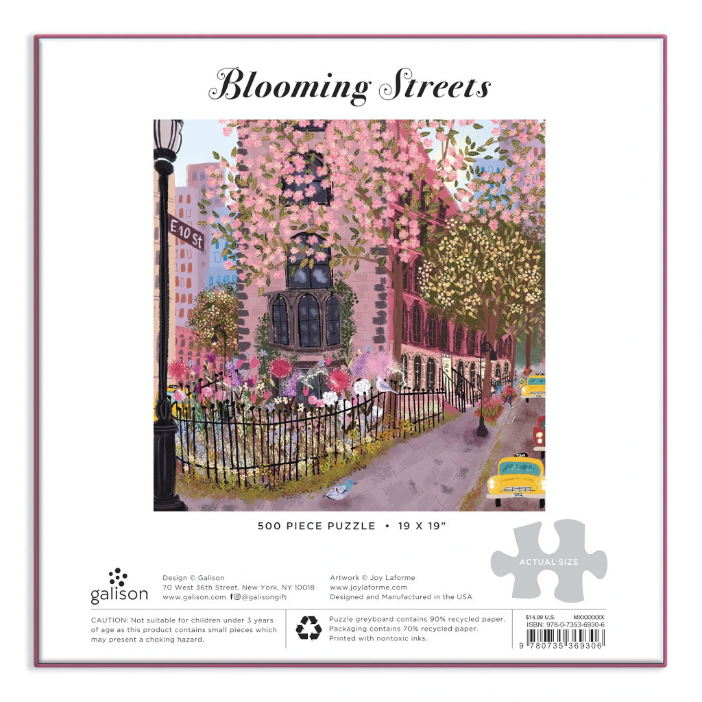 500dílné puzzle Blooming Streets po sestavení odhalí nádhernou květinovou ulici NYC. Puzzle je baleno v pevné krabici s matným povrchem, ideální jako dárek. Vyrobeno v USA, ilustrováno americkou umělkyní Joy Laforme.