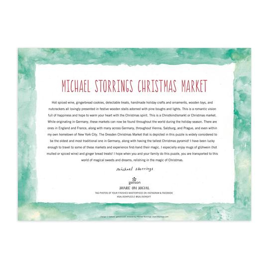 Vánoce v Drážďanech 1000dílné puzzle oživuje shon a shon zasněžených německých Vánoc v Drážďanech. Puzzle jsou baleny v pevných krabicích s matným povrchem. Oceňovaný ilustrátor Michael Storrings zachycuje zvláštní podstatu a kouzlo měst v různých ročních obdobích.