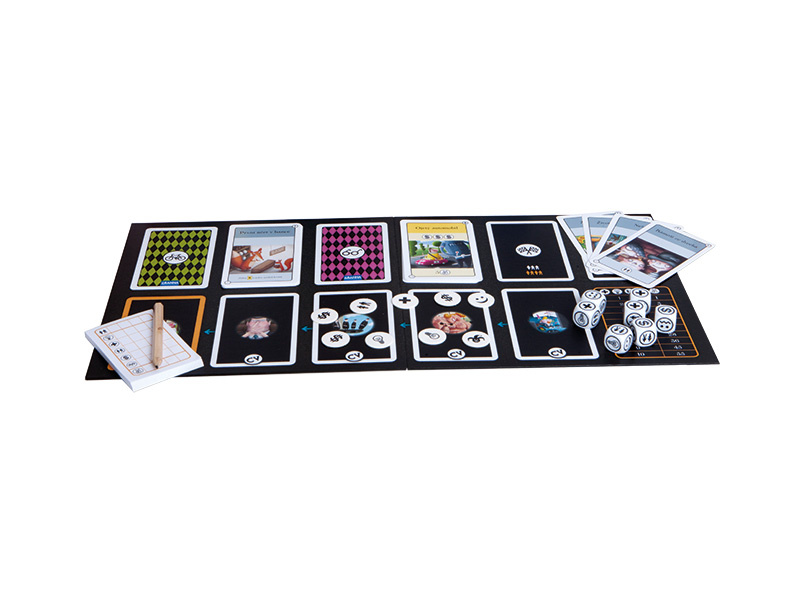 87 karet, 7 kostek,hrací plocha, 49 žetonů, zápisník, tužka, český a slovenský návod